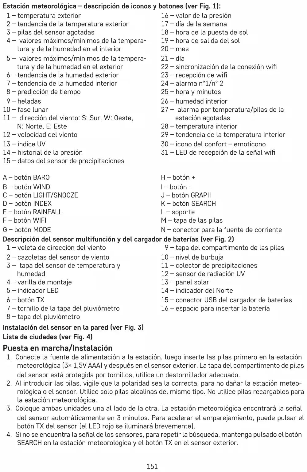 - Questo apparecchio non è destinato all’uso da parte di persone (compresi i bambini) le cui incapacità siche, sensoriali o mentali o la cui mancanza di esperienza o di conoscenze im- pediscono loro di utilizzare l’apparecchio in modo sicuro, a meno che non siano sorvegliate o istruite sull’uso di questo apparecchio da una persona responsabile della loro sicurezza. È necessario tenere d’occhio i bambini per assicurarsi che non giochino con l’apparecchio. Non smaltire con i riuti domestici. Utilizza punti di raccolta speciali per i riuti dierenziati. Contatta le autorit à locali per informazioni sui punti di raccolta. Se i dispositivi elettronici dovessero essere smaltiti in discarica, le sostanze pericolose potrebbero raggiungere le acque sotterranee e, di conseguenza, la catena alimentare, dove potrebbe inuire sulla salute umana. Con la presente, EMOS spol. s r. o. dichiara che l‘apparecchiatura radio tipo E5059 è conforme alla direttiva 2014/53/UE. Il testo completo della dichiarazione di conformità UE è disponibile al seguente indirizzo internet: http://www.emos.eu/download. ES | Estación meteorológica inalámbrica Especicaciones técnicas: Reloj dirigido por señal wi Formato de hora: 12/24 h Temperatura interior: de -10 °C hasta +50 °C, intervalos de 0,1 °C Temperatura exterior: de -40 °C hasta +70 °C, intervalos de 0,1 °C Precisión de la medición de la temperatura: ±1 °C Humedad interior y exterior: de 1 % a 99 % RH, intervalo de 1 % Precisión de medición de la humedad: 3 % para el rango de 30 % a 80 %, en el resto 5 % Visualización de la temperatura medida: °C/°F Rango de medición de la presión barométrica: de 850 hPa a 1 050 hPa Unidades de presión: hPa/inHg/mmHg Rango de medición del sensor de viento: 0–215 km/h Unidades de viento: km/mph Rango de medición del sensor de precipitaciones: 0–999,9 mm Unidades de precipitación: mm/inch Alcance de la señal de radio: hasta 50 m en espacio abierto Conexión de las unidades: mediante señal de radio 868 MHz, 25 mW PRA máx. Conexión de la unidad principal a la red wi: 2,4 GHz, 25 mW PIRE máx. Alimentación de la estación: 3 pilas de 1,5 V AAA (no incluidas) Adaptador AC 230V/DC 5V, 1,2A (incluido en el paquete) Alimentación del sensor de temperatura/humedad/viento/precipitación/radiación UV: 1 pila Li-ion 21700T de 3,7 V y 4 400 mAh (incluida) Dimensiones y peso de la estación: 30 × 215 × 173 mm; 545 g (sin pilas) Dimensiones y peso del sensor: 151 × 396 × 313 mm; 972 g (sin pilas)151 Estación meteorológica – descripción de iconos y botones (ver Fig. 1): 1 – temperatura exterior 2 – tendencia de la temperatura exterior 3 – pilas del sensor agotadas 4 – valores máximos/mínimos de la tempera- tura y de la humedad en el interior 5 – valores máximos/mínimos de la tempera- tura y de la humedad en el exterior 6 – tendencia de la humedad exterior 7 – tendencia de la humedad interior 8 – predicción de tiempo 9 – heladas 10 – fase lunar 11 – dirección del viento: S: Sur, W: Oeste, N: Norte, E: Este 12 – velocidad del viento 13 – índice UV 14 – historial de la presión 15 – datos del sensor de precipitaciones 16 – valor de la presión 17 – día de la semana 18 – hora de la puesta de sol 19 – hora de salida del sol 20 – mes 21 – día 22 – sincronización de la conexión wi 23 – recepción de wi 24 – alarma n°1/n° 2 25 – hora y minutos 26 – humedad interior 27 – alarma por temperatura/pilas de la estación agotadas 28 – temperatura interior 29 – tendencia de la temperatura interior 30 – icono del confort – emoticono 31 – LED de recepción de la señal wi A – botón BARO B – botón WIND C – botón LIGHT/SNOOZE D – botón INDEX E – botón RAINFALL F – botón WIFI G – botón MODE H – botón + I – botón - J – botón GRAPH K – botón SEARCH L – soporte M – tapa de las pilas N – conector para la fuente de corriente Descripción del sensor multifunción y del cargador de baterías (ver Fig. 2) 1 – veleta de dirección del viento 2 – cazoletas del sensor de viento 3 – tapa del sensor de temperatura y humedad 4 – varilla de montaje 5 – indicador LED 6 – botón TX 7 – tornillo de la tapa del pluviómetro 8 – tapa del pluviómetro 9 – tapa del compartimento de las pilas 10 – nivel de burbuja 11 – colector de precipitaciones 12 – sensor de radiación UV 13 – panel solar 14 – indicador del Norte 15 – conector USB del cargador de baterías 16 – espacio para insertar la batería Instalación del sensor en la pared (ver Fig. 3) Lista de ciudades (ver Fig. 4) Puesta en marcha/Instalación