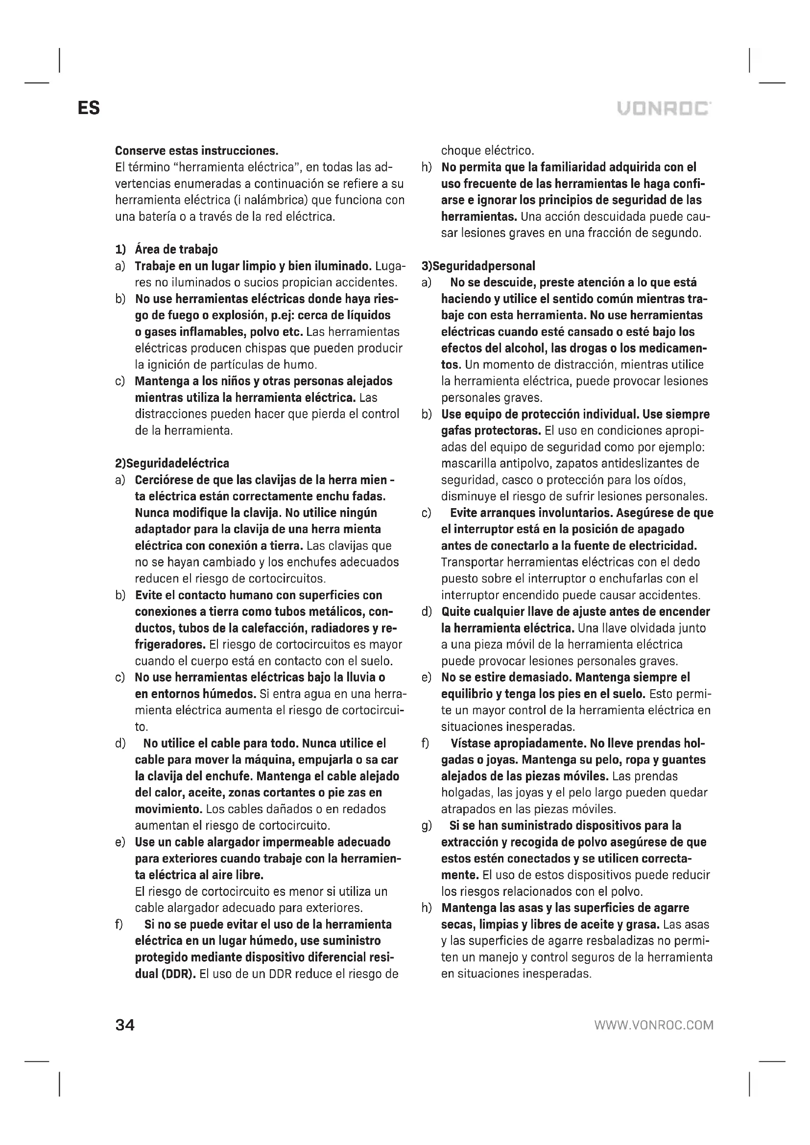 La presente constituye la única garantía implícita y explícita que ofrece la compañía. No existen otras garantías explícitas o implícitas que excedan las citadas aquí, incluidas las garantías implícitas de comerciabilidad e idoneidad para una finalidad en especial. VONROC no será considerada responsa- ble en ningún caso por daños incidentales o consecuentes. Los recursos a disposición de los distribuidores se limitan a la reparación o a la sus- titución de las unidades o piezas no conformes. El producto y el manual de usuario están sujetos a variaciones. Las especificaciones pueden variarse sin previo aviso.