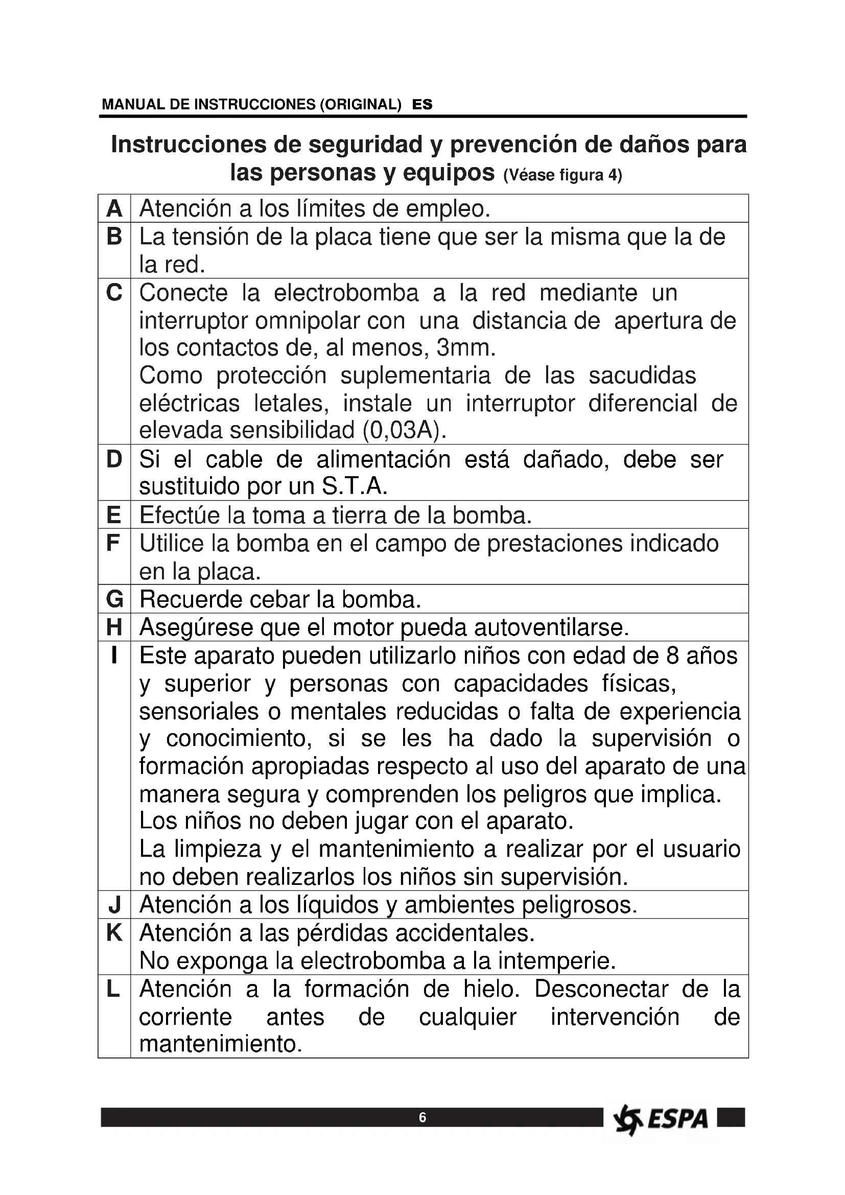 Las instrucciones que facilitamos tienen por objeto informar sobre la correcta instalación y óptimo rendimiento de nuestras bombas. Lea estas instrucciones antes de realizar la instalación de la bomba. Guárdelas para futuras consultas. Son bombas centrífugas multicelulares verticales compuestas por diversos rodetes en serie que obtienen el mismo caudal a diversas presiones, según el número de ellos dispuestos. Están concebidas para trabajar con aguas limpias, exentas de sólidos en suspensión y a una tempera- tura máxima de 40°C. El adecuado seguimiento de las instruccio- nes de instalación y uso, así como de los esquemas de conexión eléctricos garantiza el buen funcionamiento de la bomba. La omisión de las instrucciones de este manual puede derivar en sobrecargas en el motor, merma de las características técnicas, reducción de la vida de la bomba y consecuencias de todo tipo, acerca de las cuales declinamos cualquier responsabilidad. Índice de eficiencia mínima En aplicación del reglamento europeo 547/2012, el índice de eficiencia mínima a partir de 01/01/2015 debe ser MEI ≥ 0,40. El valor de referencia para las bombas hidráulicas más eficientes es MEI ≥ 0,70. Las curvas de rendimiento y sus características de eficiencia pueden consultarse en los catálogos técnicos y en www.espa.com. El funcionamiento de esta bomba hidráulica con puntos de trabajo variables puede resultar más eficiente y económico si se controla, por ejemplo, mediante un mando de regulación de velocidad que ajuste el trabajo de la bomba al sistema. La información sobre los criterios de referencia de la eficiencia puede consultarse en: http://global.espa.com/doc-descarrega-1/fingerprints.pdf