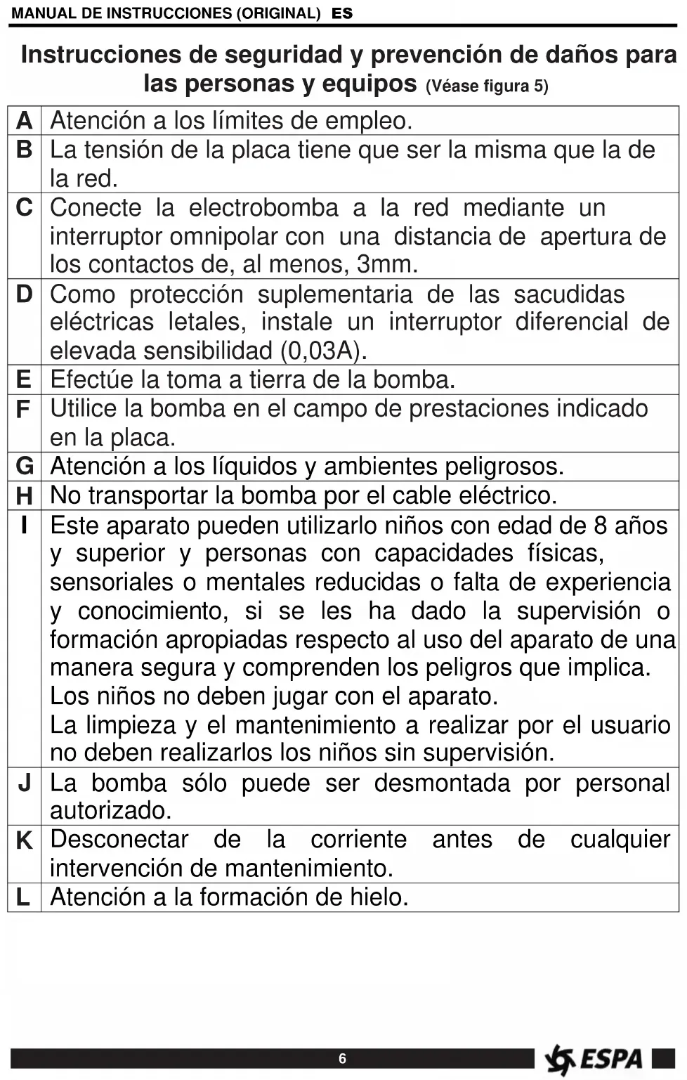 Llegado el momento de desechar la bomba, esta no contiene ningún material tóxico ni contaminante. Los componentes principales están debidamente identificados para poder proceder a un desguace selectivo. La eliminación de este producto o partes de él debe realizarse de forma respetuosa con el medio ambiente, utilice el servicio local de recogida de residuos. Si esto no es posible, contacte con el servicio técnico de ESPA más cercano.