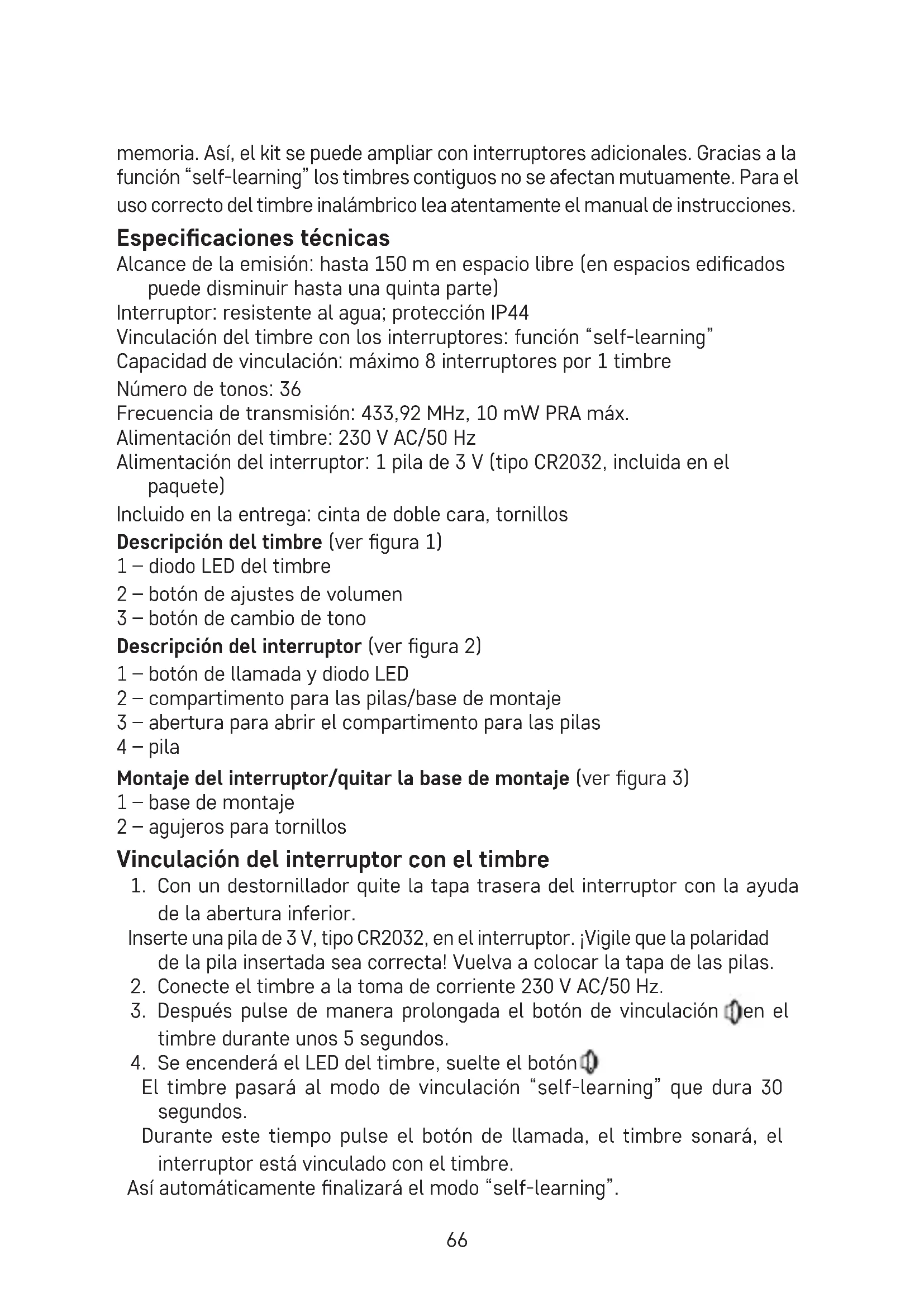 El timbre pasará al modo de vinculación “self-learning” que dura 30 segundos. Durante este tiempo pulse el botón de llamada, el timbre sonará, el interruptor está vinculado con el timbre. Así automáticamente nalizará el modo “self-learning”.67
