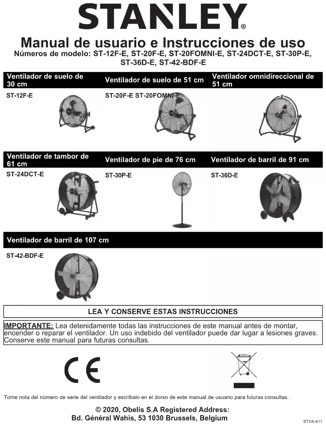 REP© 2020, Obelis S.A Registered Address: Bd. Général Wahis, 53 1030 Brussels, Belgium Tome nota del número de serie del ventilador y escríbalo en el dorso de este manual de usuario para futuras consultas. STVA-411