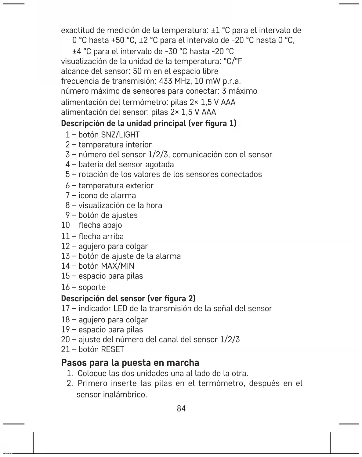 botón de echa arriba o abajo. Ajuste del formato de la hora 12/24 h Pulsando repetidamente el botón seleccionará el formato de la hora 12/24 h. Selección de la unidad de temperatura °C/°F Pulsando repetidamente el botón de la echa abajo ajustará la unidad de la temperatura mostrada °C o °F. Ajuste de la alarma Pulse de manera prolongada el botón y con los botones / ajuste la hora de la alarma. Para cambiar entre los valores pulse el botón . Tras ajustar la hora y los minutos vuelva a pulsar el botón . El icono de la alarma en la pantalla signica que la alarma está activada. Para desactivar la alarma vuelva a apretar el botón , el icono desaparecerá. Para volver a visualizar la hora estándar espere 20 segundos o pulse el botón .87 Función de la alarma repetida (snooze) y retroiluminación de la pantalla Apretando el botón SNZ/LIGHT cuando suena la alarma la pospone 5 minutos. En la pantalla parpadeará el icono . Para desactivar la función snooze pulse cualquier botón excepto SNZ/LIGHT. Si no quiere usar la función snooze, cuando suene la alarma pulse cualquier otro botón excepto SNZ/LIGHT, el despertador volverá a sonar al día siguiente. Si mientras suena la alarma no pulsa ningún botón, seguirá sonando durante 2 minutos y volverá a sonar al día siguiente. En el modo estándar pulsando el botón SNZ/LIGHT activará la retroi- luminación de la pantalla durante 5 segundos. Memoria de los valores medidos Pulsando repetidamente el botón visualizará los valores medidos máximos y mínimos de la temperatura exterior e interior. Para borrar la memoria pulse de manera prolongada el botón . Instrucciones y advertencias de seguridad Antes de usar el aparato lea atentamente el manual de uso. Siga las instrucciones de seguridad indicadas en este manual. El producto está diseñado para que su vida útil sea larga y able si se utiliza de una manera adecuada.