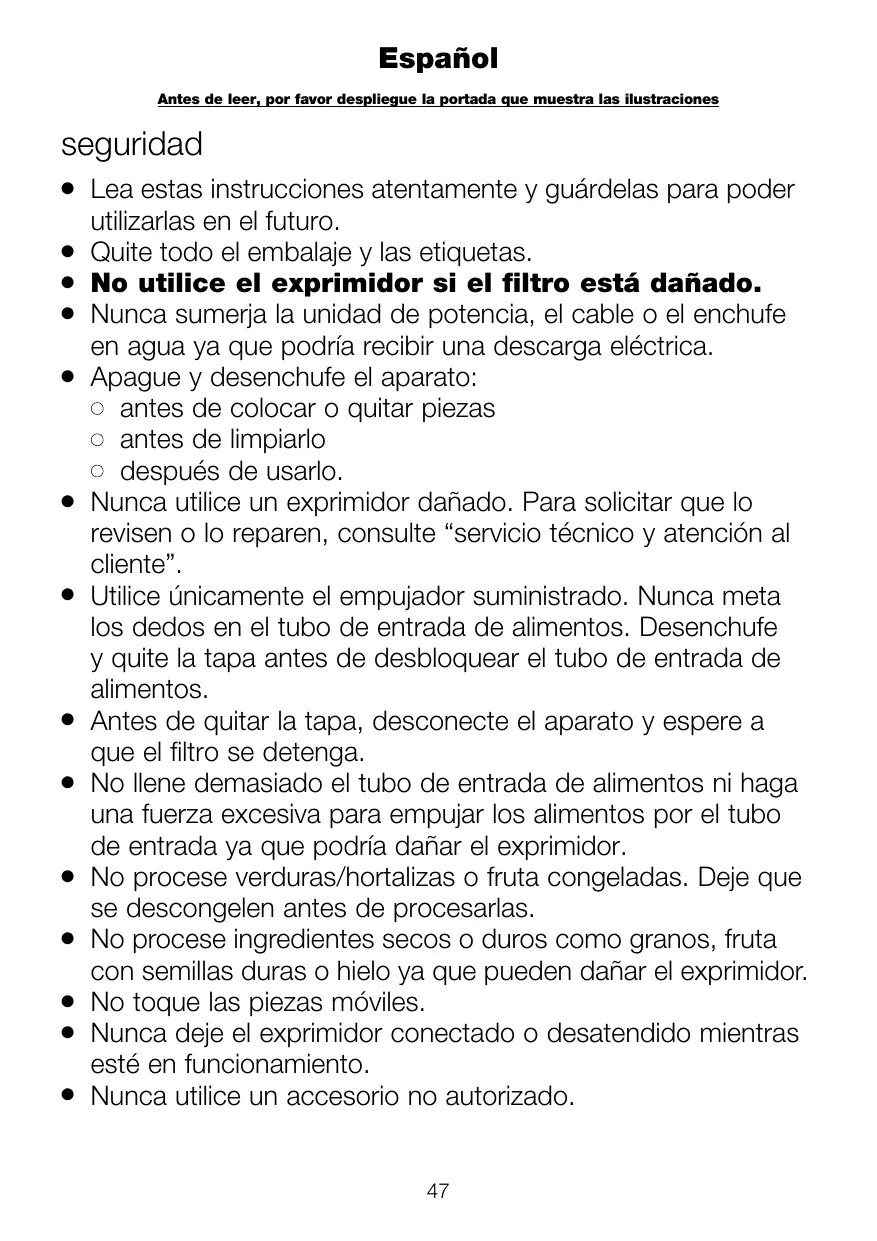 Quite todo el embalaje y las etiquetas. No utilice el exprimidor si el filtro está dañado. Nunca sumerja la unidad de potencia, el cable o el enchufe en agua ya que podría recibir una descarga eléctrica. Apague y desenchufe el aparato: antes de colocar o quitar piezas antes de limpiarlo después de usarlo. Nunca utilice un exprimidor dañado. Para solicitar que lo revisen o lo reparen, consulte “servicio técnico y atención al cliente”. Utilice únicamente el empujador suministrado. Nunca meta los dedos en el tubo de entrada de alimentos. Desenchufe y quite la tapa antes de desbloquear el tubo de entrada de alimentos. Antes de quitar la tapa, desconecte el aparato y espere a que el filtro se detenga. No llene demasiado el tubo de entrada de alimentos ni haga una fuerza excesiva para empujar los alimentos por el tubo de entrada ya que podría dañar el exprimidor. No procese verduras/hortalizas o fruta congeladas. Deje que se descongelen antes de procesarlas. No procese ingredientes secos o duros como granos, fruta con semillas duras o hielo ya que pueden dañar el exprimidor. No toque las piezas móviles. Nunca deje el exprimidor conectado o desatendido mientras esté en funcionamiento. Nunca utilice un accesorio no autorizado. 47
