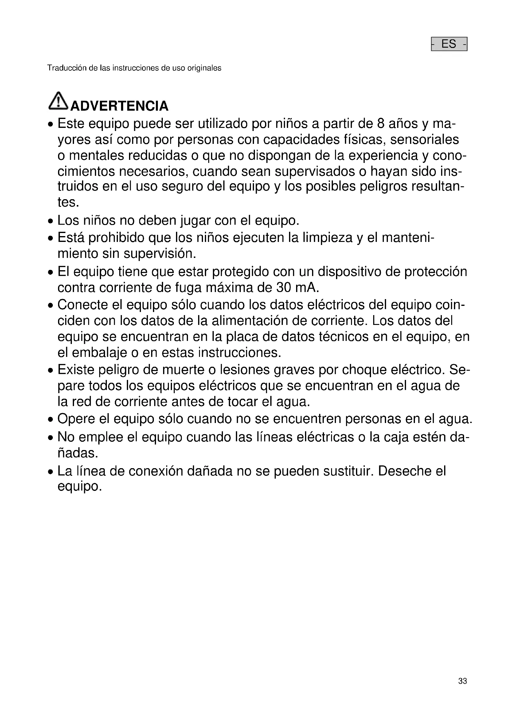 ADVERTENCIA ADVERTENCIA Este equipo puede ser utilizado por niños a partir de 8 años y ma- yores así como por personas con capacidades físicas, sensoriales o mentales reducidas o que no dispongan de la experiencia y cono- cimientos necesarios, cuando sean supervisados o hayan sido ins- truidos en el uso seguro del equipo y los posibles peligros resultan- tes. Los niños no deben jugar con el equipo. Está prohibido que los niños ejecuten la limpieza y el manteni- miento sin supervisión. El equipo tiene que estar protegido con un dispositivo de protección contra corriente de fuga máxima de 30 mA. Conecte el equipo sólo cuando los datos eléctricos del equipo coin- ciden con los datos de la alimentación de corriente. Los datos del equipo se encuentran en la placa de datos técnicos en el equipo, en el embalaje o en estas instrucciones. Existe peligro de muerte o lesiones graves por choque eléctrico. Se- pare todos los equipos eléctricos que se encuentran en el agua de la red de corriente antes de tocar el agua. Opere el equipo sólo cuando no se encuentren personas en el agua. No emplee el equipo cuando las líneas eléctricas o la caja estén da- ñadas. La línea de conexión dañada no se pueden sustituir. Deseche el equipo.- ES -