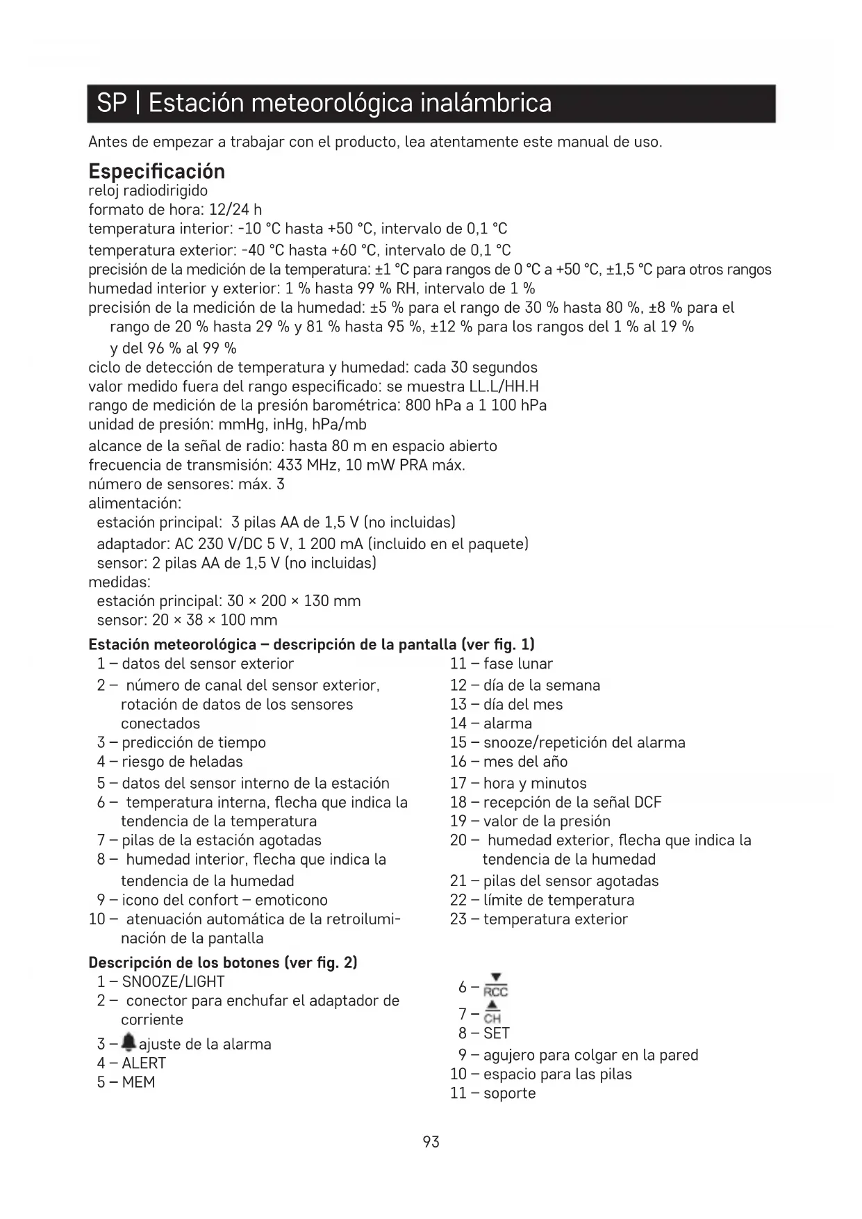 - Questo apparecchio non è destinato all’uso da parte di persone (compresi i bambini) le cui inabilità siche, sensoriali o mentali o la cui mancanza di esperienza o di conoscenze impediscono loro di utilizzare l’apparecchio in modo sicuro, a meno che non siano sorvegliate o istruite sull’uso di questo apparecchio da una persona responsabile della loro sicurezza. Non smaltire con i riuti domestici. Utilizza punti di raccolta speciali per i riuti dierenziati. Contatta le autorit à locali per informazioni sui punti di raccolta. Se i dispositivi elettronici dovessero essere smaltiti in discarica, le sostanze pericolose potrebbero raggiungere le acque sotterranee e, di conseguenza, la catena alimentare, dove potrebbe inuire sulla salute umana. Con la presente, EMOS spol. s r. o. dichiara che l‘apparecchiatura radio tipo E0387 è conforme alla direttiva 2014/53/UE. Il testo completo della dichiarazione di conformità UE è disponibile al seguente indirizzo internet: http://www.emos.eu/download.93 SP | Estación meteorológica inalámbrica Antes de empezar a trabajar con el producto, lea atentamente este manual de uso. Especicación reloj radiodirigido formato de hora: 12/24 h temperatura interior: -10 °C hasta +50 °C, intervalo de 0,1 °C temperatura exterior: -40 °C hasta +60 °C, intervalo de 0,1 °C precisión de la medición de la temperatura: ±1 °C para rangos de 0 °C a +50 °C, ±1,5 °C para otros rangos humedad interior y exterior: 1 % hasta 99 % RH, intervalo de 1 % precisión de la medición de la humedad: ±5 % para el rango de 30 % hasta 80 %, ±8 % para el rango de 20 % hasta 29 % y 81 % hasta 95 %, ±12 % para los rangos del 1 % al 19 % y del 96 % al 99 % ciclo de detección de temperatura y humedad: cada 30 segundos valor medido fuera del rango especicado: se muestra LL.L/HH.H rango de medición de la presión barométrica: 800 hPa a 1 100 hPa unidad de presión: mmHg, inHg, hPa/mb alcance de la señal de radio: hasta 80 m en espacio abierto frecuencia de transmisión: 433 MHz, 10 mW PRA máx. número de sensores: máx. 3 alimentación: estación principal: 3 pilas AA de 1,5 V (no incluidas) adaptador: AC 230 V/DC 5 V, 1 200 mA (incluido en el paquete) sensor: 2 pilas AA de 1,5 V (no incluidas) medidas: estación principal: 30 × 200 × 130 mm sensor: 20 × 38 × 100 mm Estación meteorológica – descripción de la pantalla (ver g. 1) 1 – datos del sensor exterior 2 – número de canal del sensor exterior, rotación de datos de los sensores conectados 3 – predicción de tiempo 4 – riesgo de heladas 5 – datos del sensor interno de la estación 6 – temperatura interna, echa que indica la tendencia de la temperatura 7 – pilas de la estación agotadas 8 – humedad interior, echa que indica la tendencia de la humedad 9 – icono del confort – emoticono 10 – atenuación automática de la retroilumi- nación de la pantalla 11 – fase lunar 12 – día de la semana 13 – día del mes 14 – alarma 15 – snooze/repetición del alarma 16 – mes del año 17 – hora y minutos 18 – recepción de la señal DCF 19 – valor de la presión 20 – humedad exterior, echa que indica la tendencia de la humedad 21 – pilas del sensor agotadas 22 – límite de temperatura 23 – temperatura exterior Descripción de los botones (ver g. 2) 1 – SNOOZE/LIGHT 2 – conector para enchufar el adaptador de corriente 3 – ajuste de la alarma 4 – ALERT 5 – MEM 6 – 7 – 8 – SET 9 – agujero para colgar en la pared 10 – espacio para las pilas 11 – soporte94 Descripción del sensor (ver g. 3) 1 – indicador LED 2 – agujero para colgar en la pared 3 – conmutador de selección de canales (CH 1, 2, 3) 4 – tapa del alojamiento de las pilas Puesta en marcha