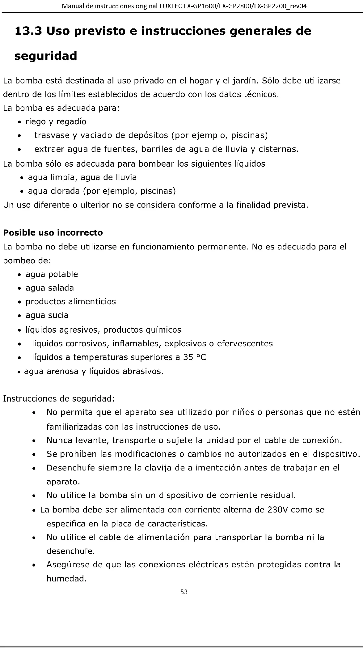 La bomba no debe eliminarse con los residuos domésticos normales, sino que debe eliminarse de acuerdo con la normativa medioambiental local. Cumplimiento de las normas de seguridad vigentes en el mercado de la UE Lea las instrucciones de uso antes de utilizarlo.Manual de instrucciones original FUXTEC FX-GP1600/FX-GP2800/FX-GP2200_rev04