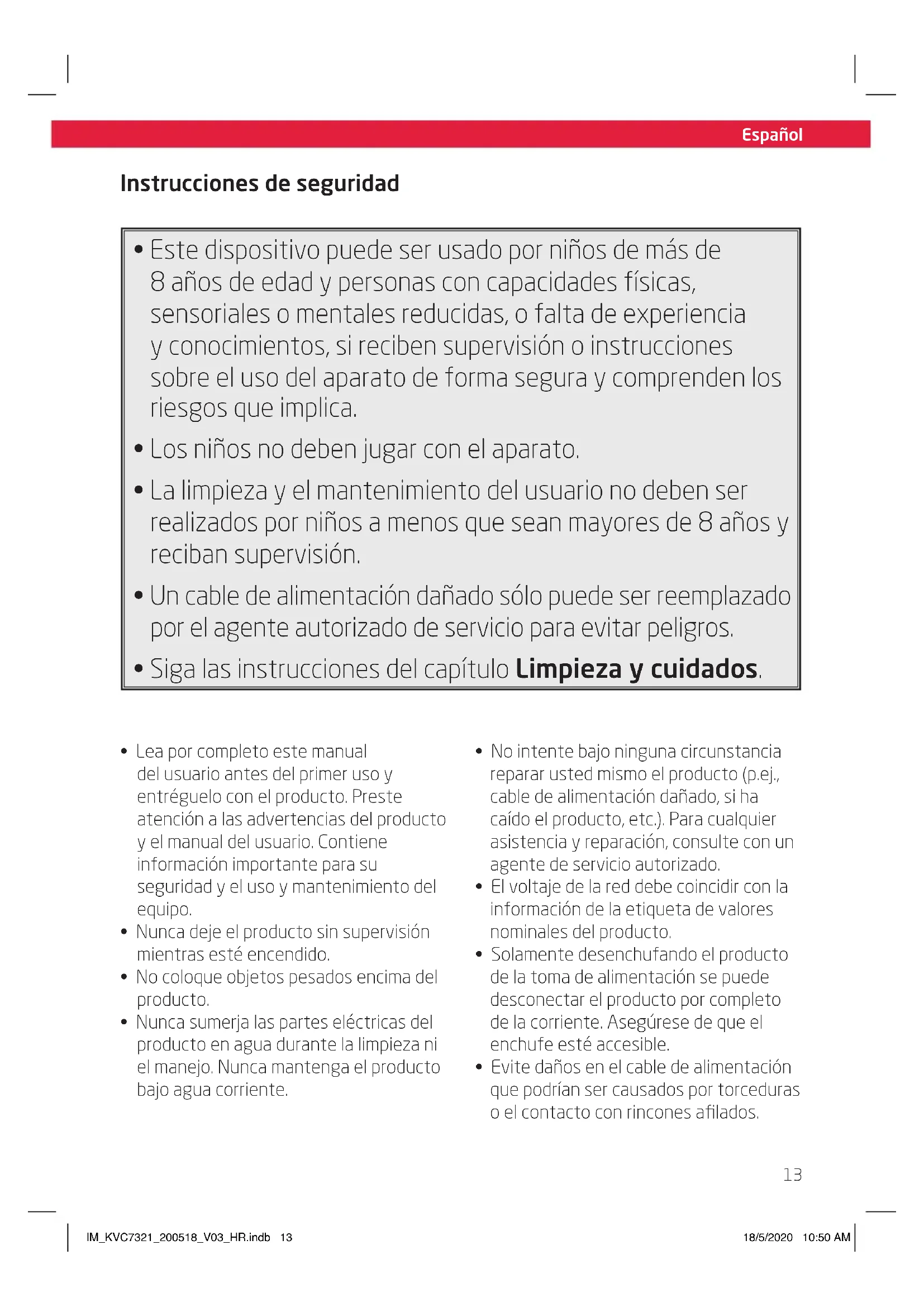 - Evite daños en el cable de alimentación que podrían ser causados por torceduras o el contacto con rincones afilados. IM_KVC7321_200518_V03_HR.indb 13IM_KVC7321_200518_V03_HR.indb 13 18/5/2020 10:50 AM18/5/2020 10:50 AMEspañol
