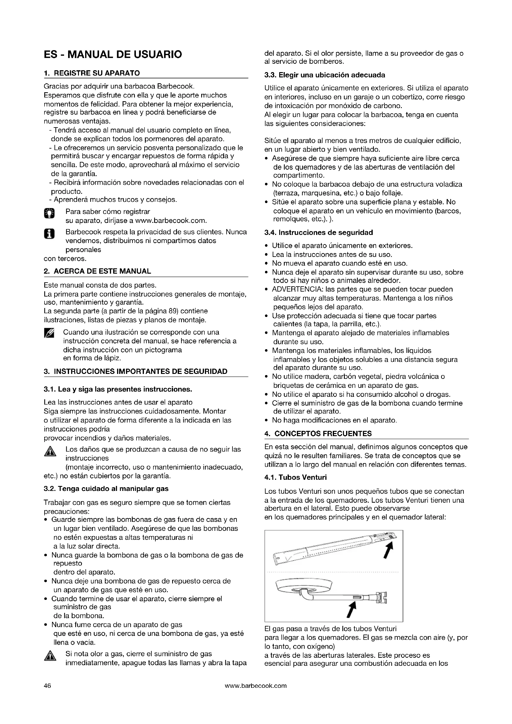 En esta sección del manual, denimos algunos conceptos que quizá no le resulten familiares. Se trata de conceptos que se utilizan a lo largo del manual en relación con diferentes temas. 4.1. Tubos Venturi Los tubos Venturi son unos pequeños tubos que se conectan a la entrada de los quemadores. Los tubos Venturi tienen una abertura en el lateral. Esto puede observarse en los quemadores principales y en el quemador lateral: El gas pasa a través de los tubos Venturi para llegar a los quemadores. El gas se mezcla con aire (y, por lo tanto, con oxígeno) a través de las aberturas laterales. Este proceso es esencial para asegurar una combustión adecuada en loswww.barbecook.com