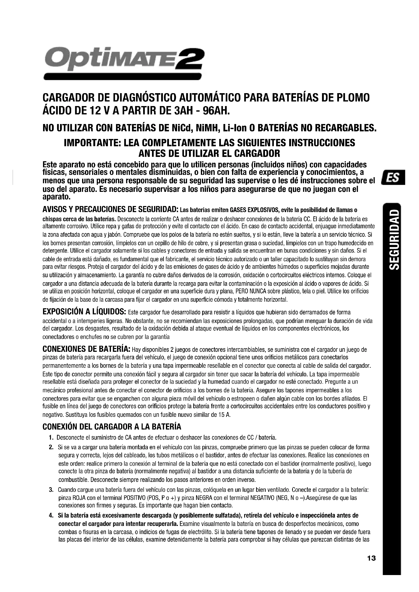Este aparato no está concebido para que lo utilicen personas (incluidos niños) con capacidades físicas, sensoriales o mentales disminuidas, o bien con falta de experiencia y conocimientos, a menos que una persona responsable de su seguridad las supervise o les dé instrucciones sobre el uso del aparato. Es necesario supervisar a los niños para asegurarse de que no juegan con el aparato. AVISOS Y PRECAUCIONES DE SEGURIDAD: Las baterías emiten GASES EXPLOSIVOS, evite la posibilidad de llamas o chispas cerca de las baterías. Desconecte la corriente CA antes de realizar o deshacer conexiones de la batería CC. El ácido de la batería es altamente corrosivo. Utilice ropa y gafas de protección y evite el contacto con el ácido. En caso de contacto accidental, enjuague inmediatamente la zona afectada con agua y jabón. Compruebe que los polos de la batería no estén sueltos, y si lo están, lleve la batería a un servicio técnico. Si los bornes presentan corrosión, límpielos con un cepillo de hilo de cobre, y si presentan grasa o suciedad, límpielos con un trapo humedecido en detergente. Utilice el cargador solamente si los cables y conectores de entrada y salida se encuentran en bunas condiciones y sin daños. Si el cable de entrada está dañado, es fundamental que el fabricante, el servicio técnico autorizado o un taller capacitado lo sustituyan sin demora para evitar riesgos. Proteja el cargador del ácido y de las emisiones de gases de ácido y de ambientes húmedos o superficies mojadas durante su utilización y almacenamiento. La garantía no cubre daños derivados de la corrosión, oxidación o cortocircuitos eléctricos internos. Coloque el cargador a una distancia adecuada de la batería durante la recarga para evitar la contaminación o la exposición al ácido o vapores de ácido. Si se utiliza en posición horizontal, coloque el cargador en una superficie dura y plana, PERO NUNCA sobre plástico, tela o piel. Utilice los orificios de fijación de la base de la carcasa para fijar el cargador en una superficie cómoda y totalmente horizontal. EXPOSICIÓN A LÍQUIDOS: Este cargador fue desarrollado para resistir a líquidos que hubieran sido derramados de forma accidental o a intemperies ligeras. No obstante, no se recomiendan las exposiciones prolongadas, que podrían menguar la duración de vida del cargador. Los desgastes, resultado de la oxidación debida al ataque eventual de líquidos en los componentes electrónicos, los conectadores o enchufes no se cubren por la garantía CONEXIONES DE BATERÍA: Hay disponibles 2 juegos de conectores intercambiables, se suministra con el cargador un juego de pinzas de batería para recargarla fuera del vehículo, el juego de conexión opcional tiene unos orificios metálicos para conectarlos permanentemente a los bornes de la batería y una tapa impermeable resellable en el conector que conecta al cable de salida del cargador. Este tipo de conector permite una conexión fácil y segura al cargador sin tener que sacar la batería del vehículo. La tapa impermeable resellable está diseñada para proteger el conector de la suciedad y la humedad cuando el cargador no esté conectado. Pregunte a un mecánico profesional antes de conectar el conector de orificios a los bornes de la batería. Asegure los tapones impermeables a los conectores para evitar que se enganchen con alguna pieza móvil del vehículo o estropeen o dañen algún cable con los bordes afilados. El fusible en línea del juego de conectores con orificios protege la batería frente a cortocircuitos accidentales entre los conductores positivo y negativo. Sustituya los fusibles quemados con un fusible nuevo similar de 15 A. CONEXIÓN DEL CARGADOR A LA BATERÍA