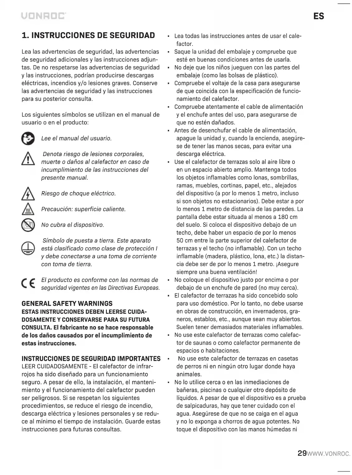 Lea las advertencias de seguridad, las advertencias de seguridad adicionales y las instrucciones adjun- tas. De no respetarse las advertencias de seguridad y las instrucciones, podrían producirse descargas eléctricas, incendios y/o lesiones graves. Conserve las advertencias de seguridad y las instrucciones para su posterior consulta. Los siguientes símbolos se utilizan en el manual de usuario o en el producto: Lee el manual del usuario. Denota riesgo de lesiones corporales, muerte o daños al calefactor en caso de incumplimiento de las instrucciones del presente manual. Riesgo de choque eléctrico. Precaución: superficie caliente. No cubra el dispositivo. Símbolo de puesta a tierra. Este aparato está clasificado como clase de protección I y debe conectarse a una toma de corriente con toma de tierra. El producto es conforme con las normas de seguridad vigentes en las Directivas Europeas.