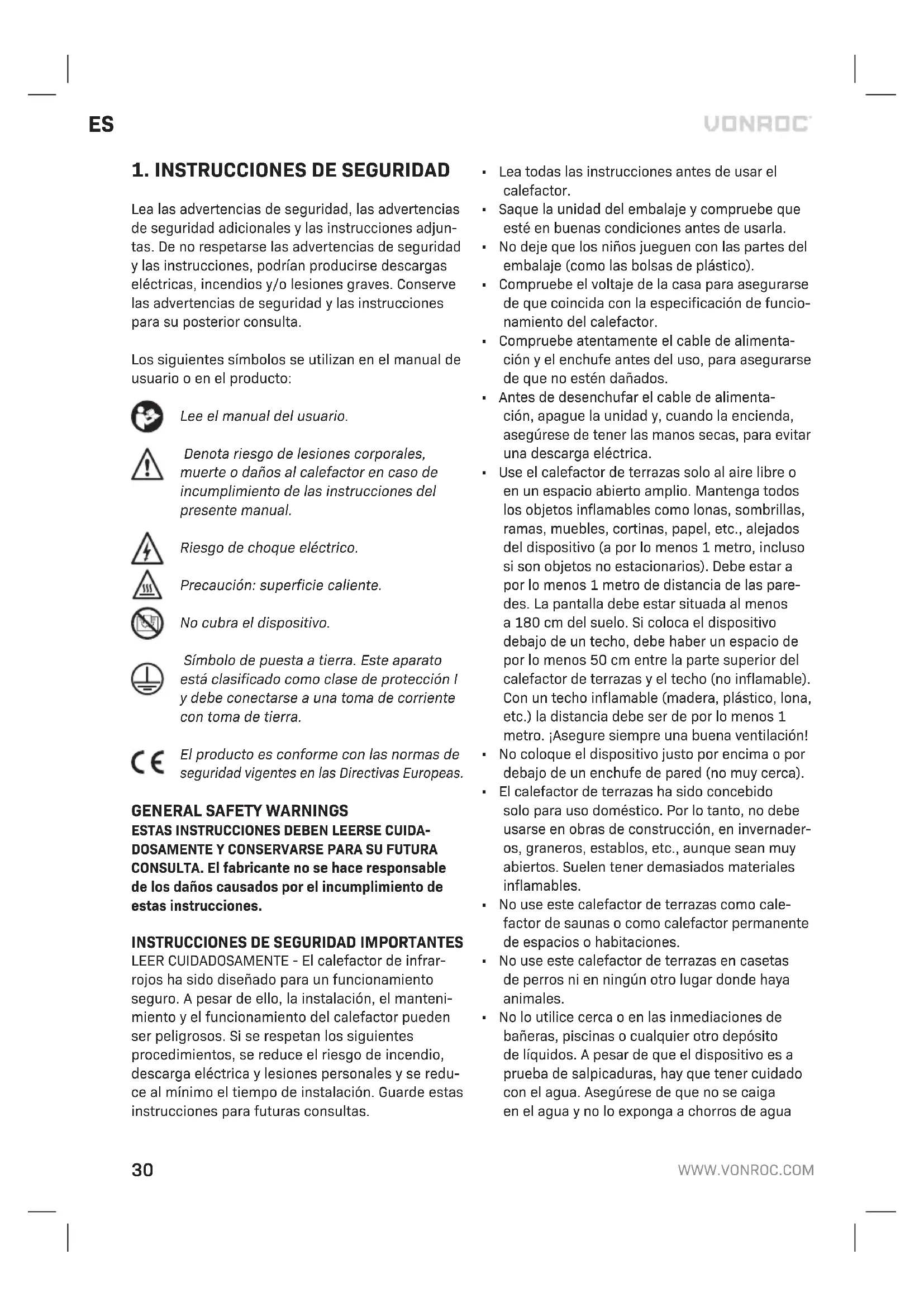 Lea las advertencias de seguridad, las advertencias de seguridad adicionales y las instrucciones adjun- tas. De no respetarse las advertencias de seguridad y las instrucciones, podrían producirse descargas eléctricas, incendios y/o lesiones graves. Conserve las advertencias de seguridad y las instrucciones para su posterior consulta. Los siguientes símbolos se utilizan en el manual de usuario o en el producto: Lee el manual del usuario. Denota riesgo de lesiones corporales, muerte o daños al calefactor en caso de incumplimiento de las instrucciones del presente manual. Riesgo de choque eléctrico. Precaución: superficie caliente. No cubra el dispositivo. Símbolo de puesta a tierra. Este aparato está clasificado como clase de protección I y debe conectarse a una toma de corriente con toma de tierra. El producto es conforme con las normas de seguridad vigentes en las Directivas Europeas.