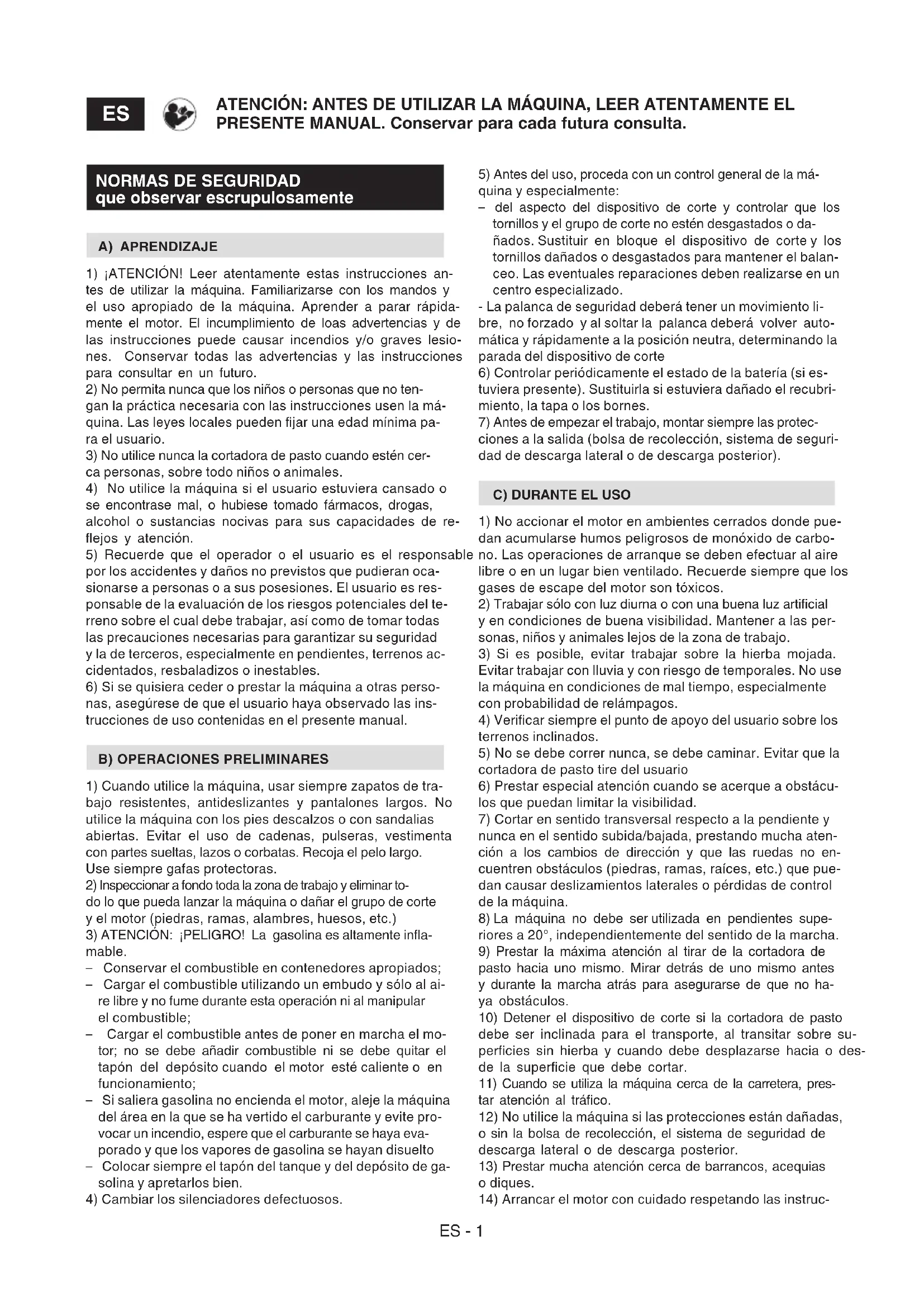 Dañada o partes aflojadas Parar la máquina y quitar el cable de la bujía Verificar eventuales daños Controlar que no haya partes flojas y apretarlas si las hubiera Proveer con los controles, sustituciones o reparaciones en un Centro Especializado En caso de dudas o problemas, contactar con el Servicio de Asistencia más cercano o con su Distribuidor.RU - 1 ПРАВИЛА ТЕХНИКИ БЕЗОПАСНОСТИ обязательные к соблюдению A) ОБУЧЕНИЕ