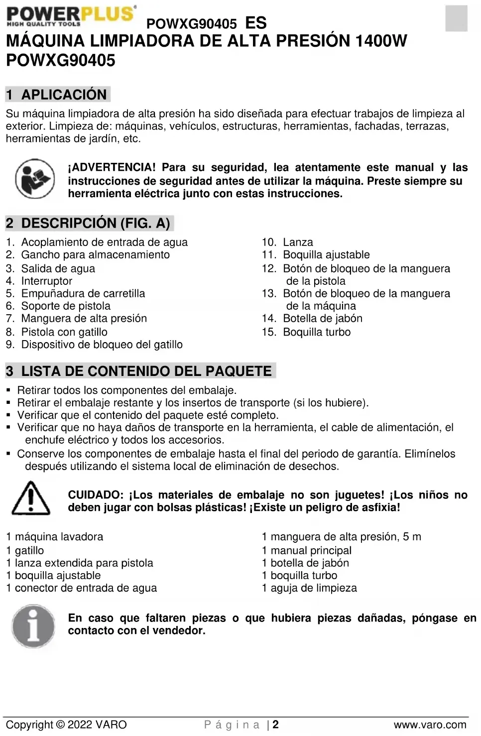 - Conserve los componentes de embalaje hasta el final del periodo de garantía. Elimínelos después utilizando el sistema local de eliminación de desechos. CUIDADO: ¡Los materiales de embalaje no son juguetes! ¡Los niños no deben jugar con bolsas plásticas! ¡Existe un peligro de asfixia! 1 máquina lavadora 1 gatillo 1 lanza extendida para pistola 1 boquilla ajustable 1 conector de entrada de agua 1 manguera de alta presión, 5 m 1 manual principal 1 botella de jabón 1 boquilla turbo 1 aguja de limpieza En caso que faltaren piezas o que hubiera piezas dañadas, póngase en contacto con el vendedor.POWXG90405 ES Copyright © 2022 VARO P á g i n a | 3 www.varo.com