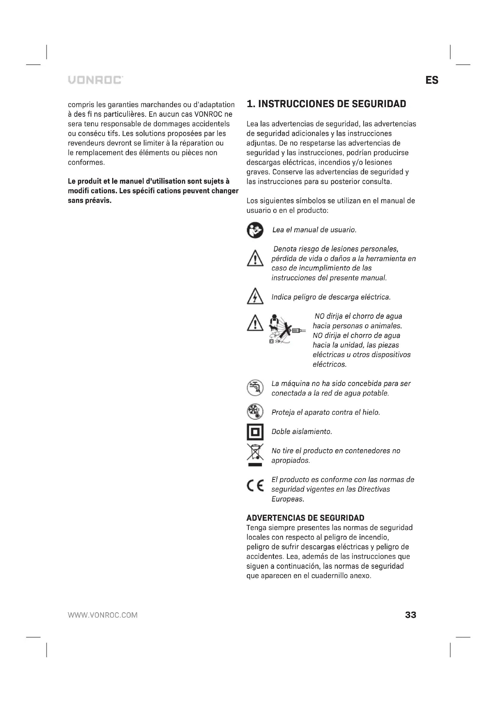 - Si se han utilizado piezas de repuesto no origi- nales. La presente constituye la única garantía implícita y explícita que ofrece la compañía. No existen otras garantías explícitas o implícitas que excedan las citadas aquí, incluidas las garantías implícitas de comerciabilidad e idoneidad para una fi nalidad en especial. VONROC no será considerada responsa- ble en ningún caso por daños incidentales o consecuentes. Los recursos a disposición de los distribuidores se limitan a la reparación o a la sus- titución de las unidades o piezas no conformes. El producto y el manual de usuario están sujetos a variaciones. Las especifi caciones pueden variarse sin previo aviso.