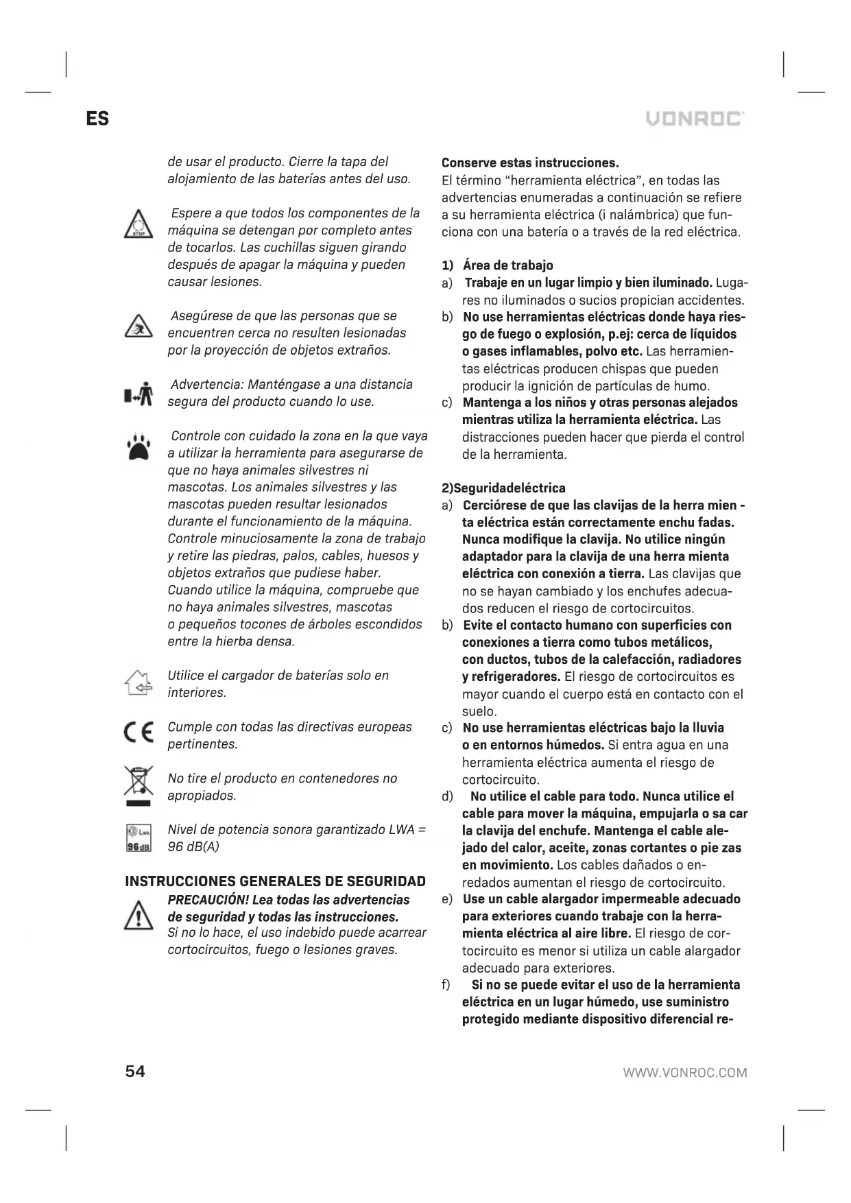 BATERÍA a) No abra la batería. Existe peligro de cortocircuito. b) Proteja la batería del calor, p. ej., de la luz solar intensa continua, los incendios, el agua y la humedad. Peligro de explosión. c) En caso de daño y uso incorrecto de la batería, esta puede emitir vapores. Ventile el área y consulte un médico si se siente mal. Los vapo- res pueden irritar el sistema respiratorio. d) Utilice la batería solo junto con su producto Vonroc. Esta medida protege la batería de sobrecargas peligrosas. e) La batería se puede dañar con objetos puntia- gudos como clavos odestornilladores osi se somete aalguna fuerza exterior. Puede produ- cirse un cortocircuito interno que dé lugar aque la batería se incendie, emita humo, explote ose sobrecaliente.