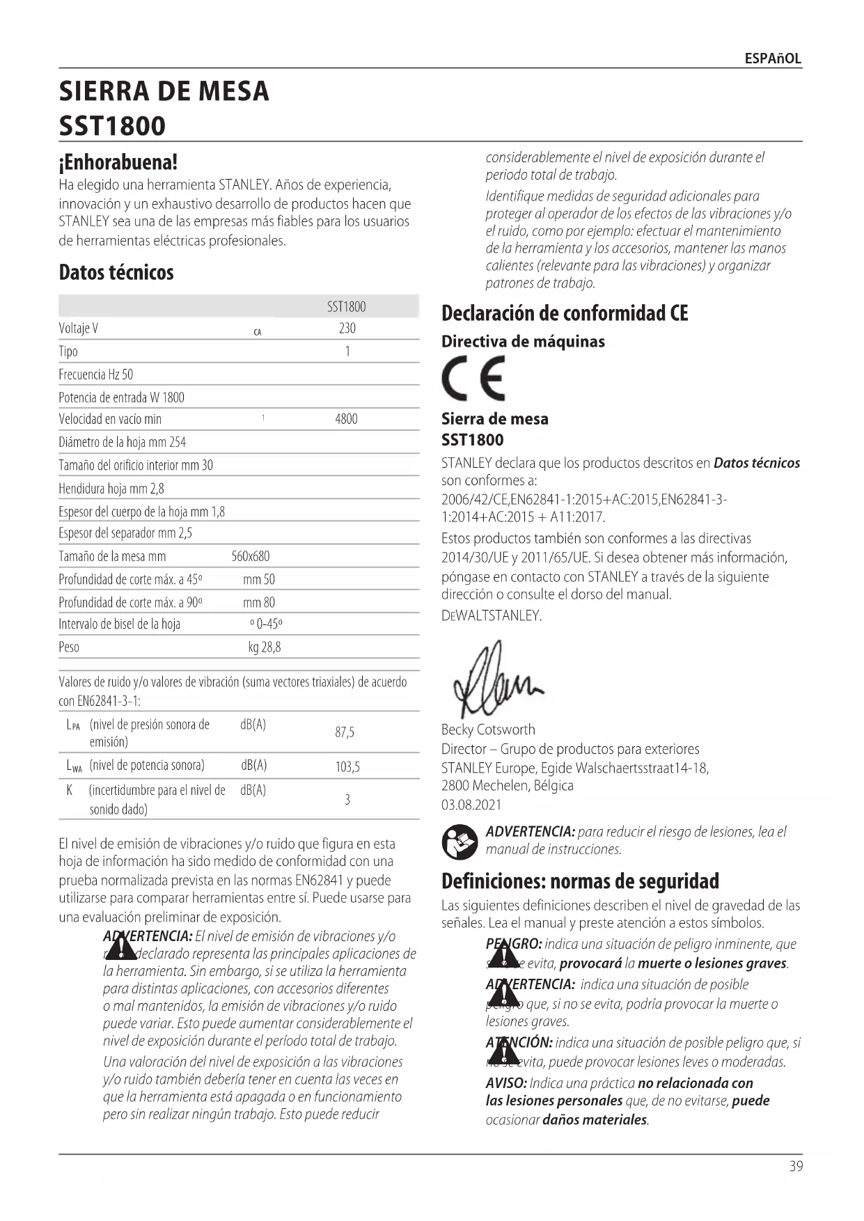 ADVERTENCIA: indica una situación de posible peligro que, si no se evita, podría provocar la muerte o lesionesgraves. ATENCIÓN: indica una situación de posible peligro que, si no se evita, puede provocar lesiones leves omoderadas. AVISO: Indica una práctica no relacionada con las lesiones personales que, de no evitarse, puede ocasionar dañosmateriales. Declaración de conformidad CE Directiva de máquinas Sierra de mesa SST1800 STANLEY declara que los productos descritos en Datos técnicos son conformes a: 2006/42/CE, EN62841‑1:2015+AC:2015, EN62841‑3‑1:2014+AC:2015 + A11:2017.Estos productos también son conformes a las directivas 2014/30/UE y 2011/65/UE. Si desea obtener más información, póngase en contacto con STANLEY a través de la siguiente dirección o consulte el dorso delmanual.DeWALTSTANLEY.Becky Cotsworth Director – Grupo de productos para exteriores STANLEY Europe, Egide Walschaertsstraat14‑18, 2800Mechelen, Bélgica 03.08.2021considerablemente el nivel de exposición durante el periodo total detrabajo.Identifique medidas de seguridad adicionales para proteger al operador de los efectos de las vibraciones y/o el ruido, como por ejemplo: efectuar el mantenimiento de la herramienta y los accesorios, mantener las manos calientes (relevante para las vibraciones) y organizar patrones detrabajo.El nivel de emisión de vibraciones y/o ruido que figura en esta hoja de información ha sido medido de conformidad con una prueba normalizada prevista en las normas EN62841 y puede utilizarse para comparar herramientas entre sí. Puede usarse para una evaluación preliminar deexposición. ADVERTENCIA: El nivel de emisión de vibraciones y/o ruido declarado representa las principales aplicaciones de la herramienta. Sin embargo, si se utiliza la herramienta para distintas aplicaciones, con accesorios diferentes o mal mantenidos, la emisión de vibraciones y/o ruido puede variar. Esto puede aumentar considerablemente el nivel de exposición durante el período total detrabajo.Una valoración del nivel de exposición a las vibraciones y/o ruido también debería tener en cuenta las veces en que la herramienta está apagada o en funcionamiento pero sin realizar ningún trabajo. Esto puede reducir SST1800Voltaje V