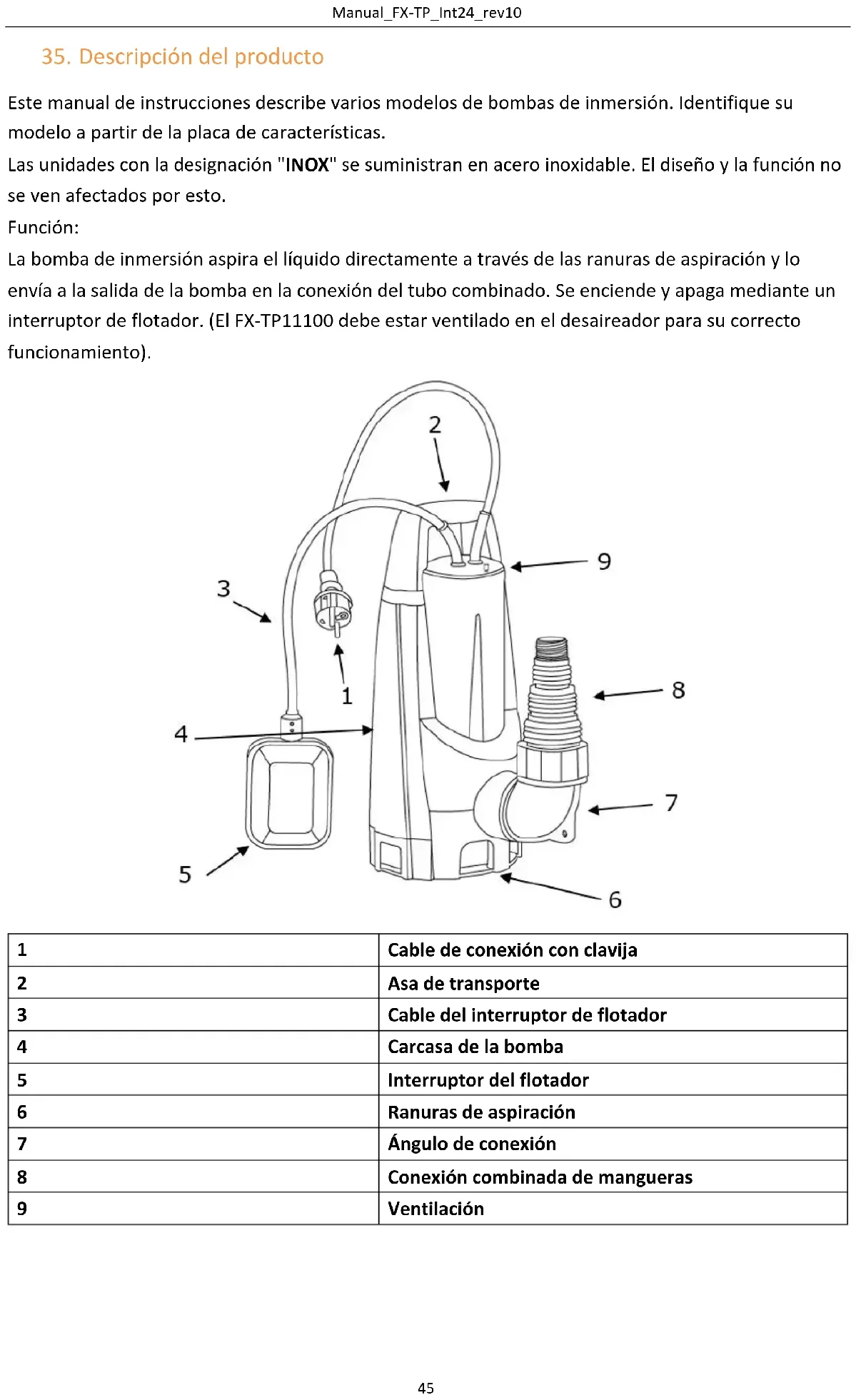 Este manual de instrucciones describe varios modelos de bombas de inmersión. Identifique su modelo a partir de la placa de características. Las unidades con la designación "INOX" se suministran en acero inoxidable. El diseño y la función no se ven afectados por esto. Función: La bomba de inmersión aspira el líquido directamente a través de las ranuras de aspiración y lo envía a la salida de la bomba en la conexión del tubo combinado. Se enciende y apaga mediante un interruptor de flotador. (El FX-TP11100 debe estar ventilado en el desaireador para su correcto funcionamiento).