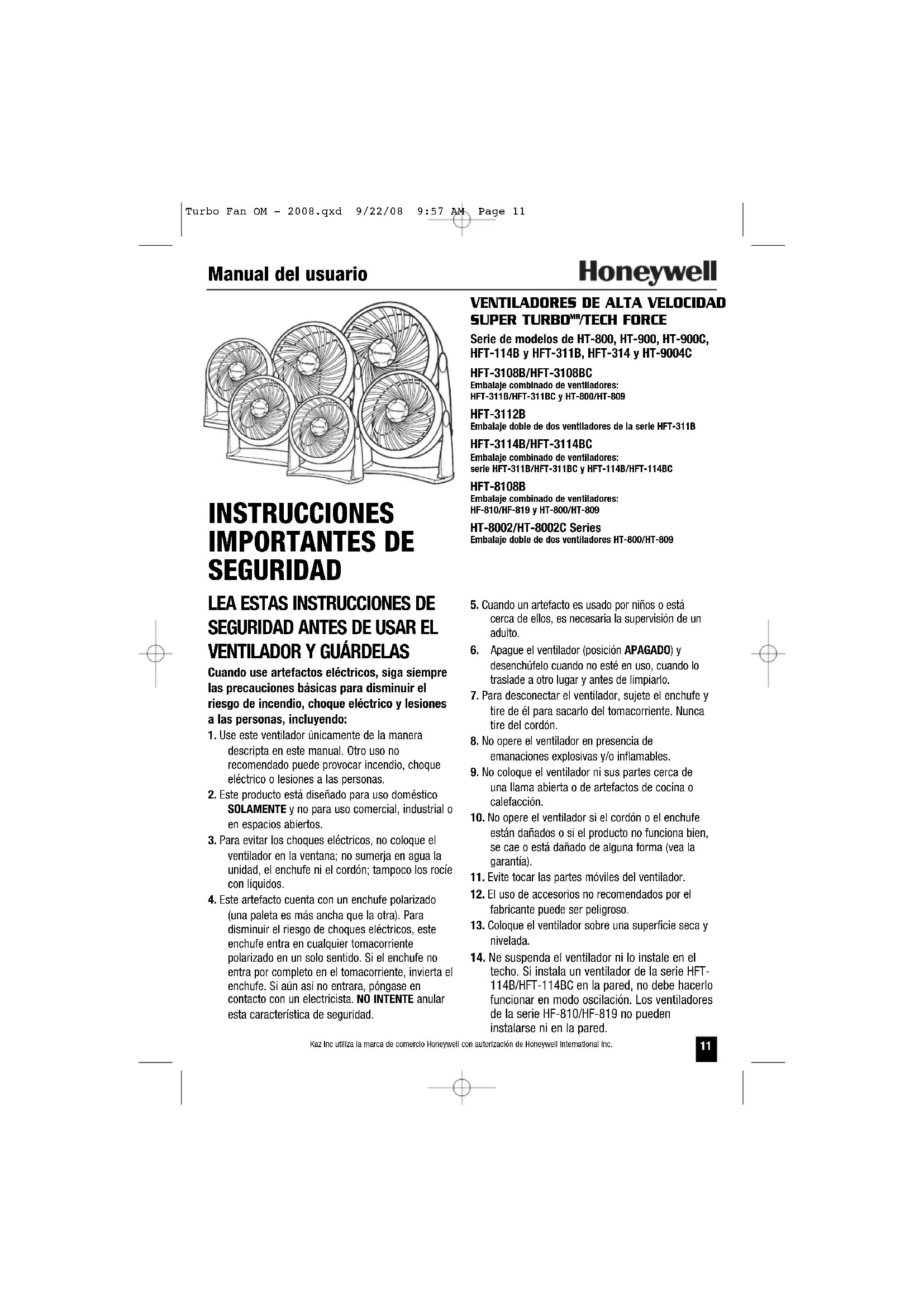 Embalaje combinado de ventiladores: serie HFT-311B/HFT-311BC y HFT-114B/HFT-114BC HFT-8108B Embalaje combinado de ventiladores: HF-810/HF-819 y HT-800/HT-809 HT-8002/HT-8002C Series Embalaje doble de dos ventiladores HT-800/HT-809Kaz Inc utiliza la marca de comercio Honeywell con autorización de Honeywell International Inc. Manual del usuario