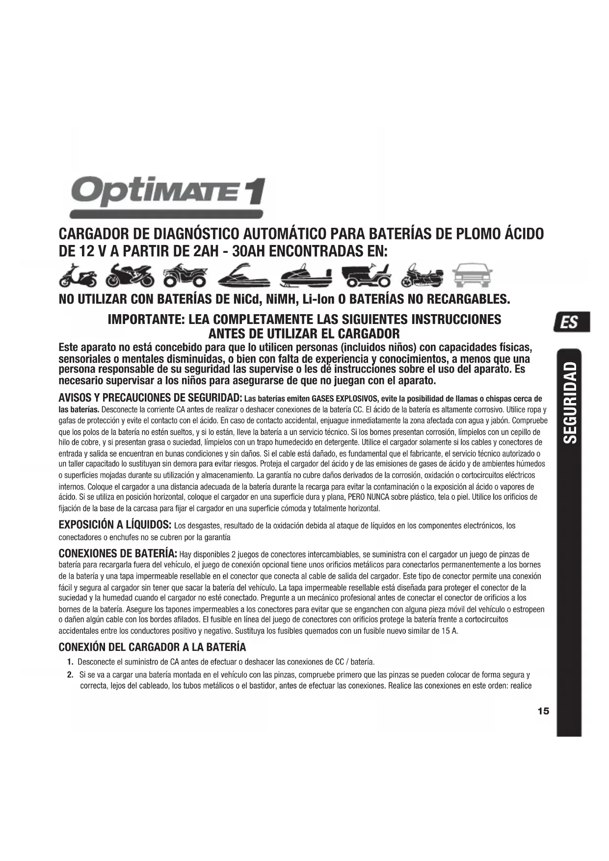 Este aparato no está concebido para que lo utilicen personas (incluidos niños) con capacidades físicas, sensoriales o mentales disminuidas, o bien con falta de experiencia y conocimientos, a menos que una persona responsable de su seguridad las supervise o les dé instrucciones sobre el uso del aparato. Es necesario supervisar a los niños para asegurarse de que no juegan con el aparato. AVISOS Y PRECAUCIONES DE SEGURIDAD: Las baterías emiten GASES EXPLOSIVOS, evite la posibilidad de llamas o chispas cerca de las baterías. Desconecte la corriente CA antes de realizar o deshacer conexiones de la batería CC. El ácido de la batería es altamente corrosivo. Utilice ropa y gafas de protección y evite el contacto con el ácido. En caso de contacto accidental, enjuague inmediatamente la zona afectada con agua y jabón. Compruebe que los polos de la batería no estén sueltos, y si lo están, lleve la batería a un servicio técnico. Si los bornes presentan corrosión, límpielos con un cepillo de hilo de cobre, y si presentan grasa o suciedad, límpielos con un trapo humedecido en detergente. Utilice el cargador solamente si los cables y conectores de entrada y salida se encuentran en bunas condiciones y sin daños. Si el cable está dañado, es fundamental que el fabricante, el servicio técnico autorizado o un taller capacitado lo sustituyan sin demora para evitar riesgos. Proteja el cargador del ácido y de las emisiones de gases de ácido y de ambientes húmedos o superficies mojadas durante su utilización y almacenamiento. La garantía no cubre daños derivados de la corrosión, oxidación o cortocircuitos eléctricos internos. Coloque el cargador a una distancia adecuada de la batería durante la recarga para evitar la contaminación o la exposición al ácido o vapores de ácido. Si se utiliza en posición horizontal, coloque el cargador en una superficie dura y plana, PERO NUNCA sobre plástico, tela o piel. Utilice los orificios de fijación de la base de la carcasa para fijar el cargador en una superficie cómoda y totalmente horizontal. EXPOSICIÓN A LÍQUIDOS: Los desgastes, resultado de la oxidación debida al ataque de líquidos en los componentes electrónicos, los conectadores o enchufes no se cubren por la garantía CONEXIONES DE BATERÍA: Hay disponibles 2 juegos de conectores intercambiables, se suministra con el cargador un juego de pinzas de batería para recargarla fuera del vehículo, el juego de conexión opcional tiene unos orificios metálicos para conectarlos permanentemente a los bornes de la batería y una tapa impermeable resellable en el conector que conecta al cable de salida del cargador. Este tipo de conector permite una conexión fácil y segura al cargador sin tener que sacar la batería del vehículo. La tapa impermeable resellable está diseñada para proteger el conector de la suciedad y la humedad cuando el cargador no esté conectado. Pregunte a un mecánico profesional antes de conectar el conector de orificios a los bornes de la batería. Asegure los tapones impermeables a los conectores para evitar que se enganchen con alguna pieza móvil del vehículo o estropeen o dañen algún cable con los bordes afilados. El fusible en línea del juego de conectores con orificios protege la batería frente a cortocircuitos accidentales entre los conductores positivo y negativo. Sustituya los fusibles quemados con un fusible nuevo similar de 15 A. CONEXIÓN DEL CARGADOR A LA BATERÍA