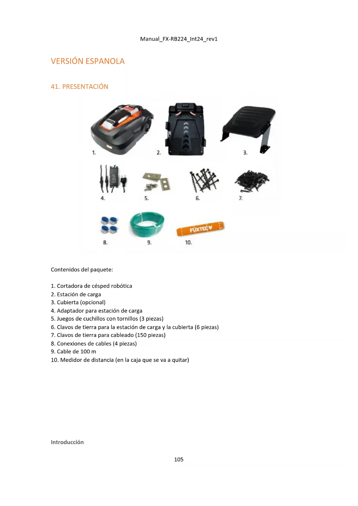 Lea atentamente el manual del usuario para poder utilizar correctamente el robot cortacésped. Para usar el cortacésped de manera segura y eficiente, se deben seguir cuidadosamente las advertencias y precauciones de seguridad de este manual del propietario. La inspección y el mantenimiento deben realizarse con el interruptor de alimentación (0) apagado. Durante el funcionamiento, los objetos se pueden tirar lejos del cortacésped. Mantenga una distancia segura de la máquina durante el funcionamiento. Ten cuidado. Asegúrese de mantener las manos y los pies alejados de las cuchillas giratorias No utilice el cortacésped como medio de transporte. Mantenga suficiente distancia de la cortadora de césped y asegúrese de que los niños y las mascotas no puedan acercarse a la cortadora de césped.Manual_FX-RB224_Int24_rev1