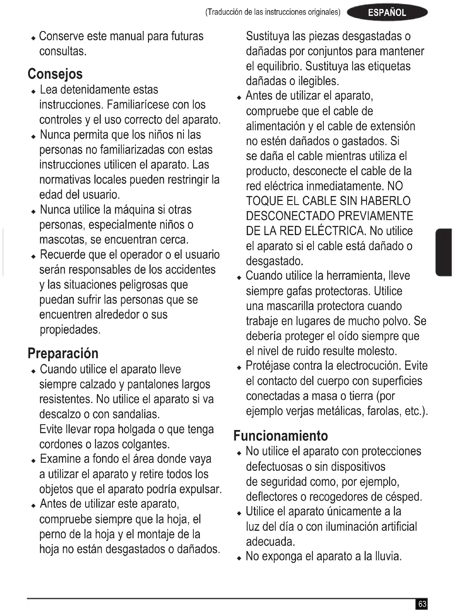 DESCONECTADO PREVIAMENTE DE LA RED ELÉCTRICA. No utilice el aparato si el cable está dañado o desgastado. u Cuando utilice la herramienta, lleve siempre gafas protectoras. Utilice una mascarilla protectora cuando trabaje en lugares de mucho polvo. Se debería proteger el oído siempre que el nivel de ruido resulte molesto. u Protéjase contra la electrocución. Evite el contacto del cuerpo con supercies conectadas a masa o tierra (por ejemplo verjas metálicas, farolas, etc.). Funcionamiento u No utilice el aparato con protecciones defectuosas o sin dispositivos de seguridad como, por ejemplo, deectores o recogedores de césped. u Utilice el aparato únicamente a la luz del día o con iluminación articial adecuada. u No exponga el aparato a la lluvia.64 (Traducción de las instrucciones originales) ESPAÑOL No utilice el aparato en condiciones de humedad y evite que penetren líquidos en su interior. Se recomienda no utilizar el aparato sobre césped mojado. u Manténgase en todo momento rmemente apoyado al suelo, especialmente cuando esté en pendiente. Tenga en cuenta que el césped recién cortado está húmedo y resbaladizo. No trabaje en pendientes pronunciadas. u Trabaje en sentido transversal a la pendiente, nunca hacia arriba o abajo. Tenga sumo cuidado al cambiar de sentido en las pendientes. u No corte el césped en cuestas demasiado pronunciadas. u Camine, nunca corra mientras usa el aparato. No dirija el aparato hacia usted ni camine hacia atrás cuando utilice el aparato. u Siga las instrucciones para encender el aparato y mantenga los pies alejados de la hoja. u No encienda el aparato cuando se encuentra delante de la abertura de expulsión de residuos. u No levante el aparato cuando lo encienda, excepto si es necesario levantar el aparato para arrancarlo. En ese caso, no levante el aparato más de lo imprescindiblemente necesario y levante sólo la parte que esté lejos del usuario. Asegúrese de mantener ambas manos en posición de trabajo antes de volver a dejar el aparato en el suelo. u Si debe levantar el aparato y transportarlo para atravesar supercies que no sean de césped o para dirigirse al área de trabajo, apague el aparato y espere a que las cuchillas se detengan por completo. u No levante ni transporte el aparato hasta que la hoja se detenga por completo. u Mantenga las manos y los pies apartados de la hoja. u No coloque las manos ni los pies cerca o debajo de piezas giratorias. u Manténgase alejado en todo momento de las aberturas de expulsión de residuos. u Antes de dejar el aparato sin vigilancia o de eliminar una obstrucción, o cuando se disponga a cambiar, limpiar o revisar alguna de sus piezas, apáguelo, desenchufe el cable de la toma de corriente y asegúrese de que las piezas móviles se han detenido por completo. Después de golpear un objeto extraño. Compruebe que la máquina no tenga daños, si lo tiene repárelos antes de volver a ponerla en marcha y utilizarla. u Si el aparato empieza a vibrar de forma inusual o si choca con un objeto extraño, apague el aparato y desenchufe el cable de la toma de corriente. Compruebe los daños del aparado, sustituya o repare las piezas dañadas y je las piezas sueltas. u Tenga sumo cuidado en mantener el cable de alimentación lejos de la hoja.65 (Traducción de las instrucciones originales) ESPAÑOL Tenga cuidado con la posición del cable en todo momento. u Después de apagar el aparato, el motor continuará en marcha durante unos segundos. No intente forzar la hoja para que se pare. Mantenimiento y almacenamiento u Antes de utilizar el aparato, compruebe que no tenga piezas dañadas ni defectuosas. Compruebe que las piezas móviles se encuentran correctamente alineadas y en buenas condiciones, que no hay piezas rotas, y que los dispositivos de protección e interruptores están en buenas condiciones, así como cualquier otro elemento que pudiera afectar al funcionamiento de la herramienta. Asegúrese de que el aparato funciona correctamente y realiza las funciones para las que ha sido diseñado. No utilice el aparato con protecciones o cierres dañados ni mal colocados. No utilice el aparato si presenta alguna pieza dañada o defectuosa. No utilice el aparato si no es posible encenderlo y apagarlo con el interruptor. Solicite al servicio técnico autorizado la reparación o sustitución de las piezas dañadas o defectuosas. u Compruebe con regularidad que el cable no ha sufrido daños. Si se llegase a dañar el cable, deberá ser sustituido por un agente autorizado para evitar cualquier situación de riesgo. Inspeccione los cables de extensión periódicamente. Si el cable de extensión está dañado o es defectuoso, sustitúyalo inmediatamente. u Mantenga todas las tuercas, pernos y tornillos del aparato apretados para asegurar unas condiciones de trabajo seguras. u Compruebe que el recolector de hierba no está dañado o desgastado y sustitúyalo si es necesario. No utilice nunca el aparato sin este recolector. u Tenga cuidado durante el ajuste del aparato para evitar que se le enganchen los dedos entre las hojas en movimiento y las piezas jas del aparato. u Cuando revise las cuchillas tenga cuidado porque, aunque la fuente de alimentación esté desconectada, aún se pueden mover. u Cuando no lo utilice, guarde el aparato en un lugar seco. Los niños no deben tener acceso a los aparatos guardados. u Deje enfriar siempre el aparato antes de guardarlo. u Asegúrese de que sólo se utilizan los repuestos de corte del tipo correcto. u Utilice únicamente piezas de repuesto y accesorios recomendados por BLACK+DECKER.66 (Traducción de las instrucciones originales) ESPAÑOL Instrucciones de seguridad adicionales para cortacéspedes u Utilice siempre un cable de prolongación aprobado que sea adecuado para la entrada de corriente de esta herramienta (consulte los datos técnicos). El cable de prolongación debe ser adecuado para su uso en exteriores y presentar las indicaciones oportunas. Se puede utiliz