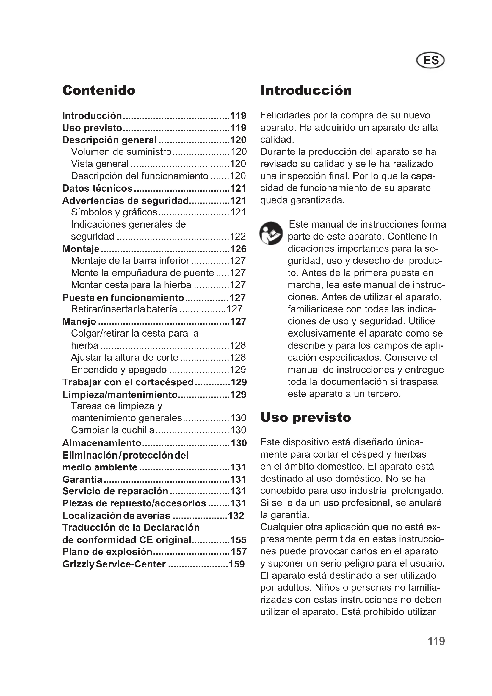 - Introducción Felicidades por la compra de su nuevo aparato. Ha adquirido un aparato de alta calidad. Durante la producción del aparato se ha revisado su calidad y se le ha realizado una inspección nal. Por lo que la capa- cidad de funcionamiento de su aparato queda garantizada. Este manual de instrucciones forma parte de este aparato. Contiene in- dicaciones importantes para la se- guridad, uso y desecho del produc- to. Antes de la primera puesta en marcha, lea este manual de instruc- ciones. Antes de utilizar el aparato, familiarícese con todas las indica- ciones de uso y seguridad. Utilice exclusivamente el aparato como se describe y para los campos de apli- cación especicados. Conserve el manual de instrucciones y entregue toda la documentación si traspasa este aparato a un tercero. Uso previsto Este dispositivo está diseñado única- mente para cortar el césped y hierbas en el ámbito doméstico. El aparato está destinado al uso doméstico. No se ha concebido para uso industrial prolongado. Si se le da un uso profesional, se anulará la garantía. Cualquier otra aplicación que no esté ex- presamente permitida en estas instruccio- nes puede provocar daños en el aparato y suponer un serio peligro para el usuario. El aparato está destinado a ser utilizado por adultos. Niños o personas no familia- rizadas con estas instrucciones no deben utilizar el aparato. Está prohibido utilizar Traducción de la Declaración de conformidad CE original p. 155