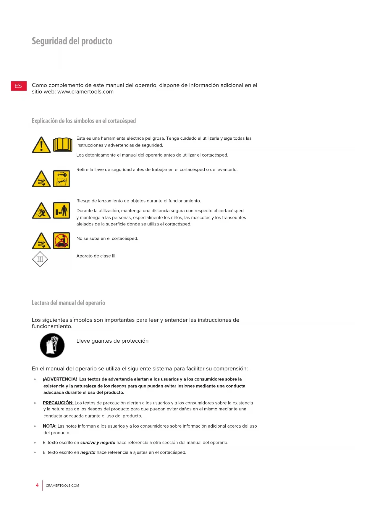 Explicación de los símbolos en el cortacésped Esta es una herramienta eléctrica peligrosa. Tenga cuidado al utilizarla y siga todas las instrucciones y advertencias de seguridad. Lea detenidamente el manual del operario antes de utilizar el cortacésped. Retire la llave de seguridad antes de trabajar en el cortacésped o de levantarlo. Riesgo de lanzamiento de objetos durante el funcionamiento. Durante la utilización, mantenga una distancia segura con respecto al cortacésped y mantenga a las personas, especialmente los niños, las mascotas y los transeúntes alejados de la superficie donde se utiliza el cortacésped. No se suba en el cortacésped. Aparato de clase III Como complemento de este manual del operario, dispone de información adicional en el sitio web: www.cramertools.com Lectura del manual del operario Los siguientes símbolos son importantes para leer y entender las instrucciones de funcionamiento. Lleve guantes de protección En el manual del operario se utiliza el siguiente sistema para facilitar su comprensión: