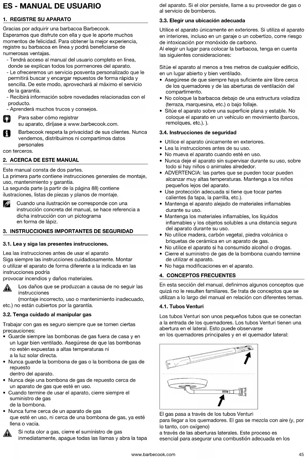 En esta sección del manual, denimos algunos conceptos que quizá no le resulten familiares. Se trata de conceptos que se utilizan a lo largo del manual en relación con diferentes temas. 4.1. Tubos Venturi Los tubos Venturi son unos pequeños tubos que se conectan a la entrada de los quemadores. Los tubos Venturi tienen una abertura en el lateral. Esto puede observarse en los quemadores principales y en el quemador lateral: El gas pasa a través de los tubos Venturi para llegar a los quemadores. El gas se mezcla con aire (y, por lo tanto, con oxígeno) a través de las aberturas laterales. Este proceso es esencial para asegurar una combustión adecuada en loswww.barbecook.com