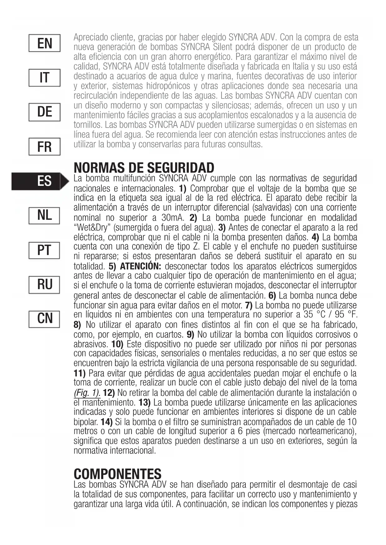 toma de corriente, realizar un bucle con el cable justo debajo del nivel de la toma (Fig. 1). 12) No retirar la bomba del cable de alimentación durante la instalación o el mantenimiento. 13) La bomba puede utilizarse únicamente en las aplicaciones indicadas y solo puede funcionar en ambientes interiores si dispone de un cable bipolar. 14) Si la bomba o el filtro se suministran acompañados de un cable de 10 metros o con un cable de longitud superior a 6 pies (mercado norteamericano), significa que estos aparatos pueden destinarse a un uso en exteriores, según la normativa internacional. COMPONENTES Las bombas SYNCRA ADV se han diseñado para permitir el desmontaje de casi la totalidad de sus componentes, para facilitar un correcto uso y mantenimiento y garantizar una larga vida útil. A continuación, se indican los componentes y piezas