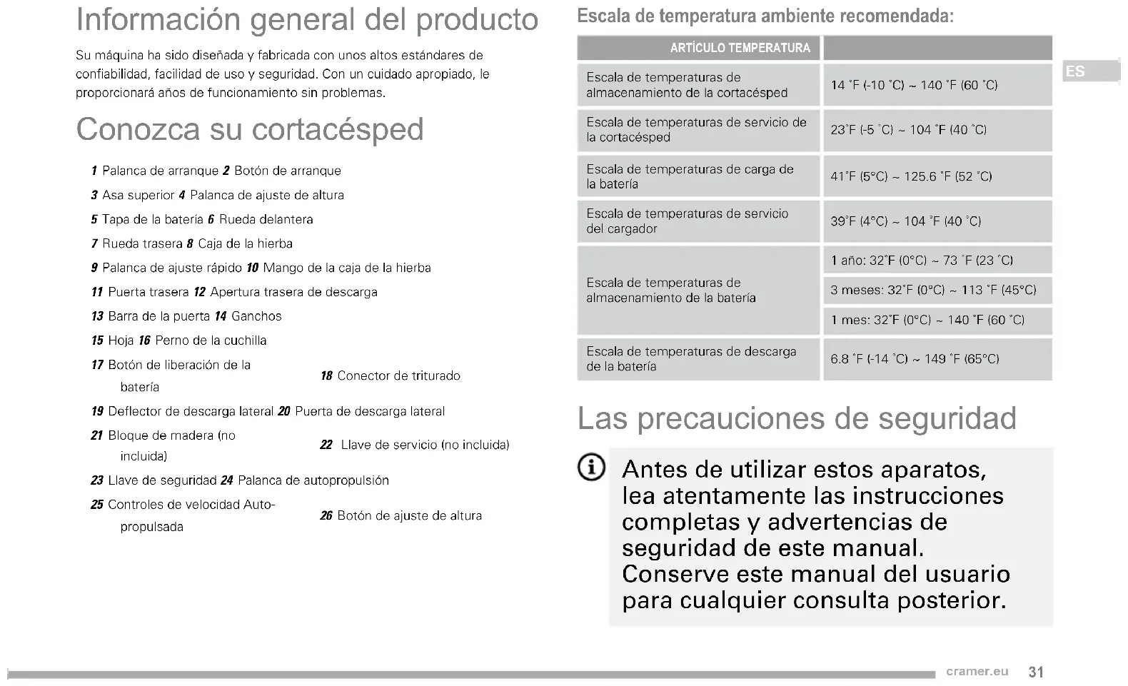 Información general del producto Su máquina ha sido diseñada y fabricada con unos altos estándares de confiabilidad, facilidad de uso y seguridad. Con un cuidado apropiado, le proporcionará años de funcionamiento sin problemas. Conozca su cortacésped 1 Palanca de arranque 2 Botón de arranque3 Asa superior 4 Palanca de ajuste de altura5 Tapa de la batería 6 Rueda delantera7 Rueda trasera 8 Caja de la hierba9 Palanca de ajuste rápido 10 Mango de la caja de la hierba11 Puerta trasera 12 Apertura trasera de descarga13 Barra de la puerta 14 Ganchos15 Hoja 16 Perno de la cuchilla17 Botón de liberación de la batería18 Conector de triturado19 Deflector de descarga lateral 20 Puerta de descarga lateral21 Bloque de madera (no incluida)22 Llave de servicio (no incluida)23 Llave de seguridad 24 Palanca de autopropulsión 25 Controles de velocidad Auto-propulsada26 Botón de ajuste de altura Escala de temperatura ambiente recomendada: ARTÍCULO TEMPERATURAEscala de temperaturas de almacenamiento de la cortacésped14 ˚F (-10 ˚C) ~ 140 ˚F (60 ˚C)Escala de temperaturas de servicio de la cortacésped23˚F (-5 ˚C) ~ 104 ˚F (40 ˚C)Escala de temperaturas de carga de la batería41˚F (5°C) ~ 125.6 ˚F (52 ˚C)Escala de temperaturas de servicio del cargador39˚F (4°C) ~ 104 ˚F (40 ˚C)Escala de temperaturas de almacenamiento de la batería1 año: 32˚F (0°C) ~ 73 ˚F (23 ˚C)3 meses: 32˚F (0°C) ~ 113 ˚F (45°C)1 mes: 32˚F (0°C) ~ 140 ˚F (60 ˚C)Escala de temperaturas de descarga de la batería6.8 ˚F (-14 ˚C) ~ 149 ˚F (65°C) Las precauciones de seguridad Antes de utilizar estos aparatos, lea atentamente las instrucciones completas y advertencias de seguridad de este manual. Conserve este manual del usuario para cualquier consulta posterior.32 cramer.eu