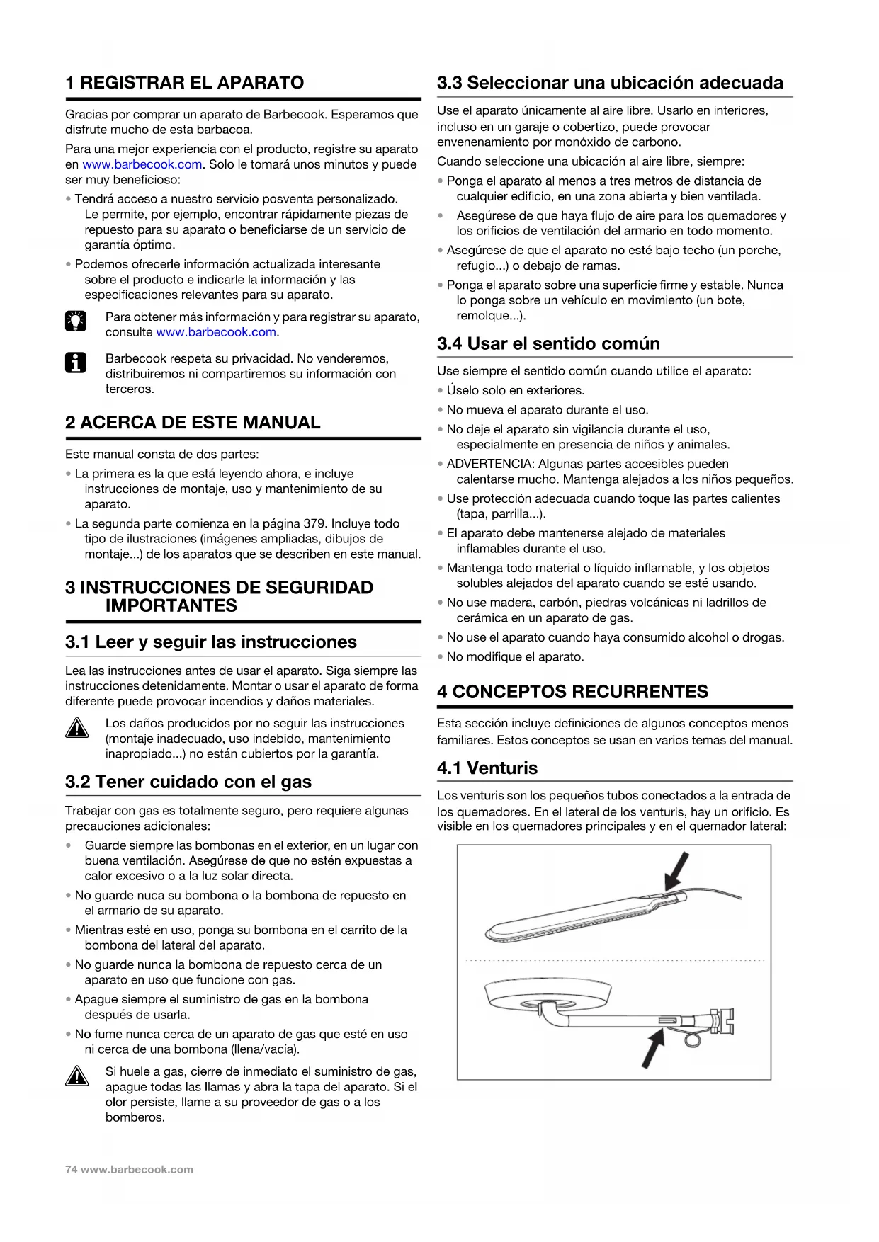 Los venturis son los pequeños tubos conectados a la entrada de los quemadores. En el lateral de los venturis, hay un orificio. Es visible en los quemadores principales y en el quemador lateral: MAN_GAS_QUISSON_BBC_140730_A.book Page 74 Tuesday, February 2, 2016 4:55 PMwww.barbecook.com 75 El gas pasa a través de los venturis para ir hacia los quemadores. Gracias a los orificios de los laterales, el gas se mezcla luego con el aire y, como resultado, con oxígeno. Esto es necesario para una buena ignición en los quemadores: solo la correcta mezcla de gas y oxígeno hará que prendan adecuadamente y generará llamas apropiadas.
