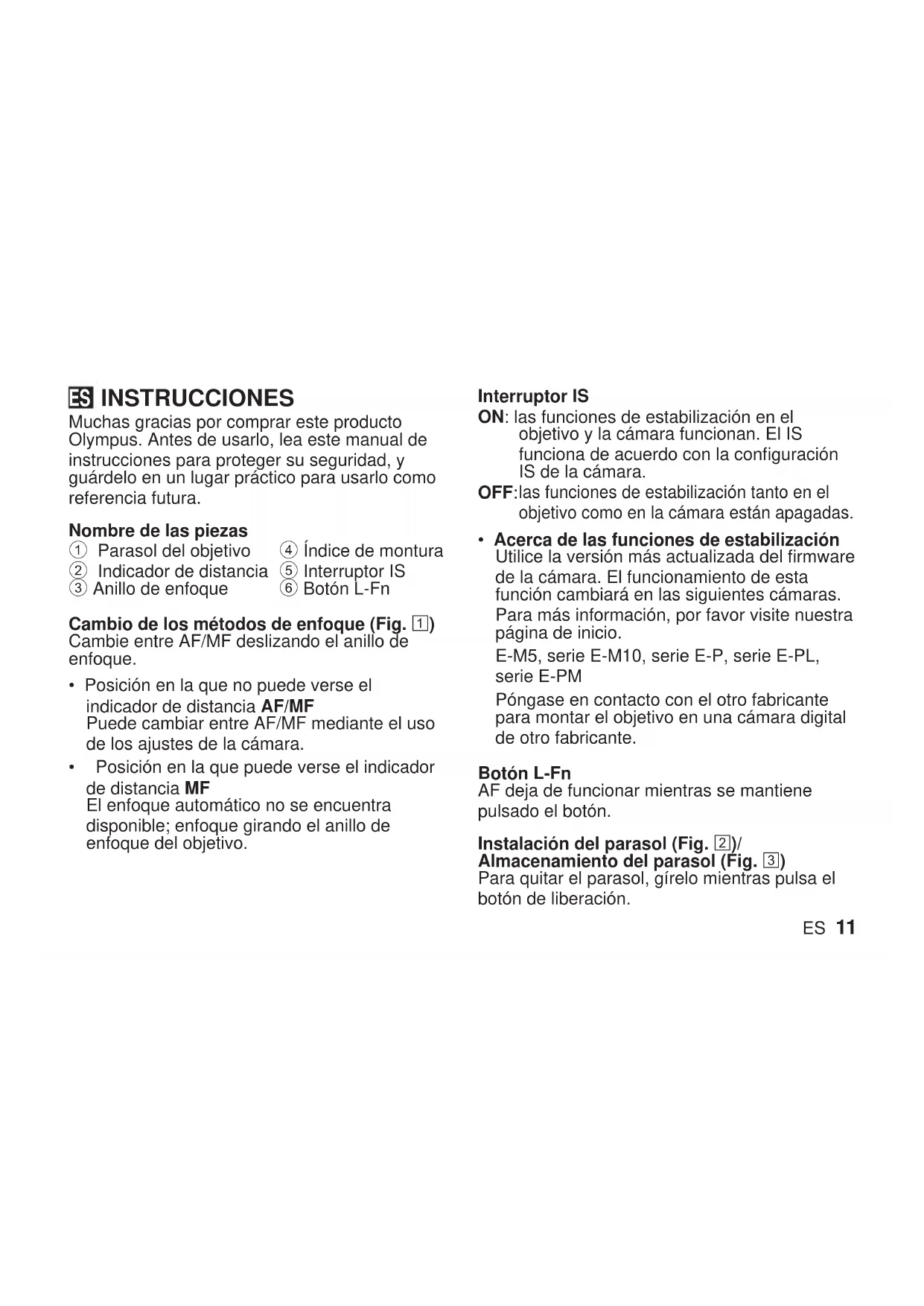 - Acerca de las funciones de estabilización Utilice la versión más actualizada del firmware de la cámara. El funcionamiento de esta función cambiará en las siguientes cámaras. Para más información, por favor visite nuestra página de inicio. E-M5, serie E-M10, serie E-P, serie E-PL, serie E-PM Póngase en contacto con el otro fabricante para montar el objetivo en una cámara digital de otro fabricante. Botón L-Fn AF deja de funcionar mientras se mantiene pulsado el botón. Instalación del parasol (Fig. 2)/ Almacenamiento del parasol (Fig. 3) Para quitar el parasol, gírelo mientras pulsa el botón de liberación. ES12 ES Notas sobre la toma fotográfica
