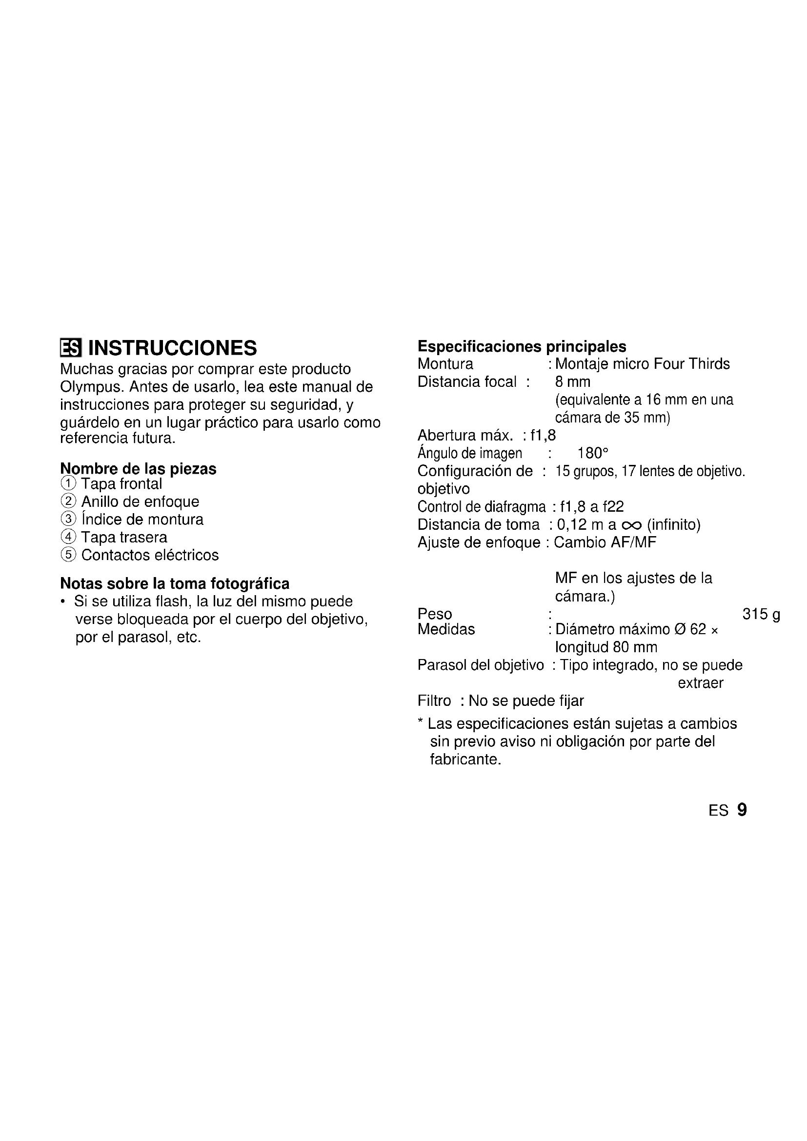 - Si se utiliza flash, la luz del mismo puede verse bloqueada por el cuerpo del objetivo, por el parasol, etc. Especificaciones principales Montura : Montaje micro Four Thirds Distancia focal : 8 mm (equivalente a 16 mm en una cámara de 35 mm) Abertura máx. : f1,8 Ángulo de imagen : 180° Configuración de : 15 grupos, 17 lentes de objetivo. objetivo Control de diafragma : f1,8 a f22 Distancia de toma : 0,12 m a ) (infinito) Ajuste de enfoque : Cambio AF/MF (Es posible seleccionar MF en los ajustes de la cámara.) Peso : 315 g (excluyendo la tapa) Medidas : Diámetro máximo Ø 62 × longitud 80 mm Parasol del objetivo : Tipo integrado, no se puede extraer Filtro : No se puede fijar