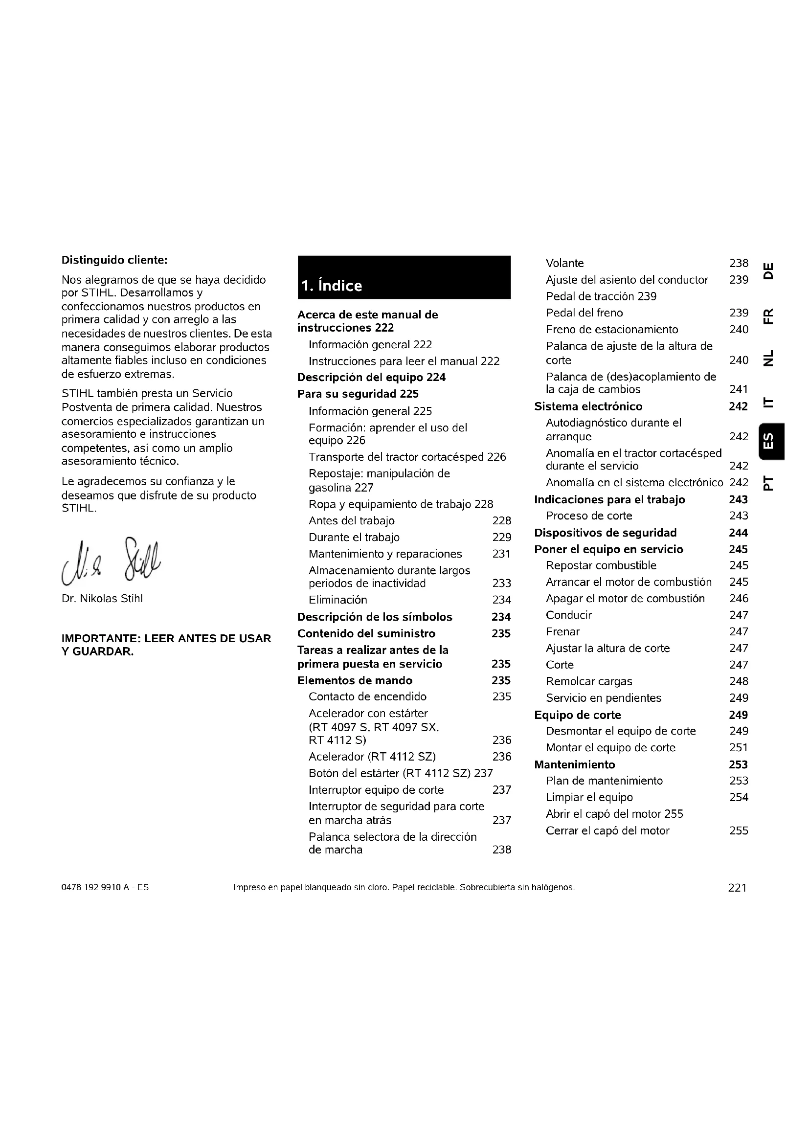 Acerca de este manual de instrucciones 222 Información general 222 Instrucciones para leer el manual 222 Descripción del equipo 224 Para su seguridad 225 Información general 225 Formación: aprender el uso del equipo 226 Transporte del tractor cortacésped 226 Repostaje: manipulación de gasolina 227 Ropa y equipamiento de trabajo 228 Antes del trabajo 228 Durante el trabajo 229 Mantenimiento y reparaciones 231 Almacenamiento durante largos periodos de inactividad 233 Eliminación 234 Descripción de los símbolos 234 Contenido del suministro 235 Tareas a realizar antes de la primera puesta en servicio 235 Elementos de mando 235 Contacto de encendido 235 Acelerador con estárter (RT 4097 S, RT 4097 SX, RT 4112 S) 236 Acelerador (RT 4112 SZ) 236 Botón del estárter (RT 4112 SZ) 237 Interruptor equipo de corte 237 Interruptor de seguridad para corte en marcha atrás 237 Palanca selectora de la dirección de marcha 238 Volante 238 Ajuste del asiento del conductor 239 Pedal de tracción 239 Pedal del freno 239 Freno de estacionamiento 240 Palanca de ajuste de la altura de corte 240 Palanca de (des)acoplamiento de la caja de cambios 241 Sistema electrónico 242 Autodiagnóstico durante el arranque 242 Anomalía en el tractor cortacésped durante el servicio 242 Anomalía en el sistema electrónico 242 Indicaciones para el trabajo 243 Proceso de corte 243 Dispositivos de seguridad 244 Poner el equipo en servicio 245 Repostar combustible 245 Arrancar el motor de combustión 245 Apagar el motor de combustión 246 Conducir 247 Frenar 247 Ajustar la altura de corte 247 Corte 247 Remolcar cargas 248 Servicio en pendientes 249 Equipo de corte 249 Desmontar el equipo de corte 249 Montar el equipo de corte 251 Mantenimiento 253 Plan de mantenimiento 253 Limpiar el equipo 254 Abrir el capó del motor 255 Cerrar el capó del motor 2550478 192 9910 A - ES