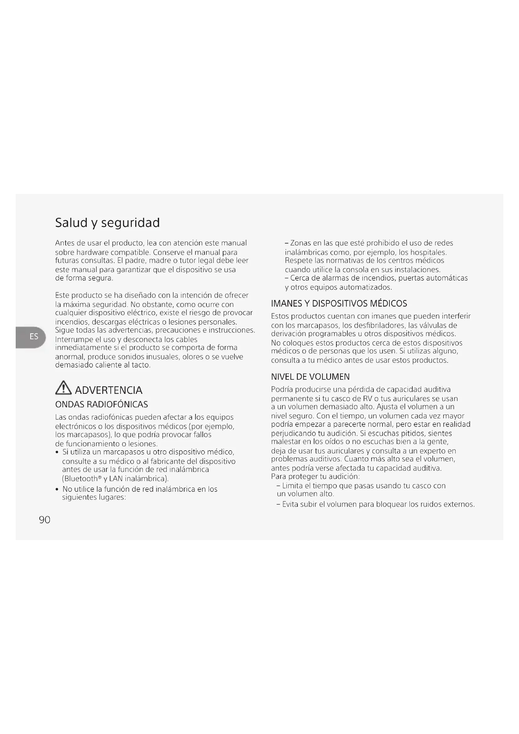 Podría producirse una pérdida de capacidad auditiva permanente si tu casco de RV o tus auriculares se usan a un volumen demasiado alto. Ajusta el volumen a un nivel seguro. Con el tiempo, un volumen cada vez mayor podría empezar a parecerte normal, pero estar en realidad perjudicando tu audición. Si escuchas pitidos, sientes malestar en los oídos o no escuchas bien a la gente, deja de usar tus auriculares y consulta a un experto en problemas auditivos. Cuanto más alto sea el volumen, antes podría verse afectada tu capacidad auditiva. Para proteger tu audición: – Limita el tiempo que pasas usando tu casco con un volumen alto. – Evita subir el volumen para bloquear los ruidos externos.Antes de usar el producto, lea con atención este manual sobre hardware compatible. Conserve el manual para futuras consultas. El padre, madre o tutor legal debe leer este manual para garantizar que el dispositivo se usa de forma segura.Este producto se ha diseñado con la intención de ofrecer la máxima seguridad. No obstante, como ocurre con cualquier dispositivo eléctrico, existe el riesgo de provocar incendios, descargas eléctricas o lesiones personales. Sigue todas las advertencias, precauciones e instrucciones.Interrumpe el uso y desconecta los cables inmediatamente si el producto se comporta de forma anormal, produce sonidos inusuales, olores o se vuelve demasiado caliente al tacto. ADVERTENCIA