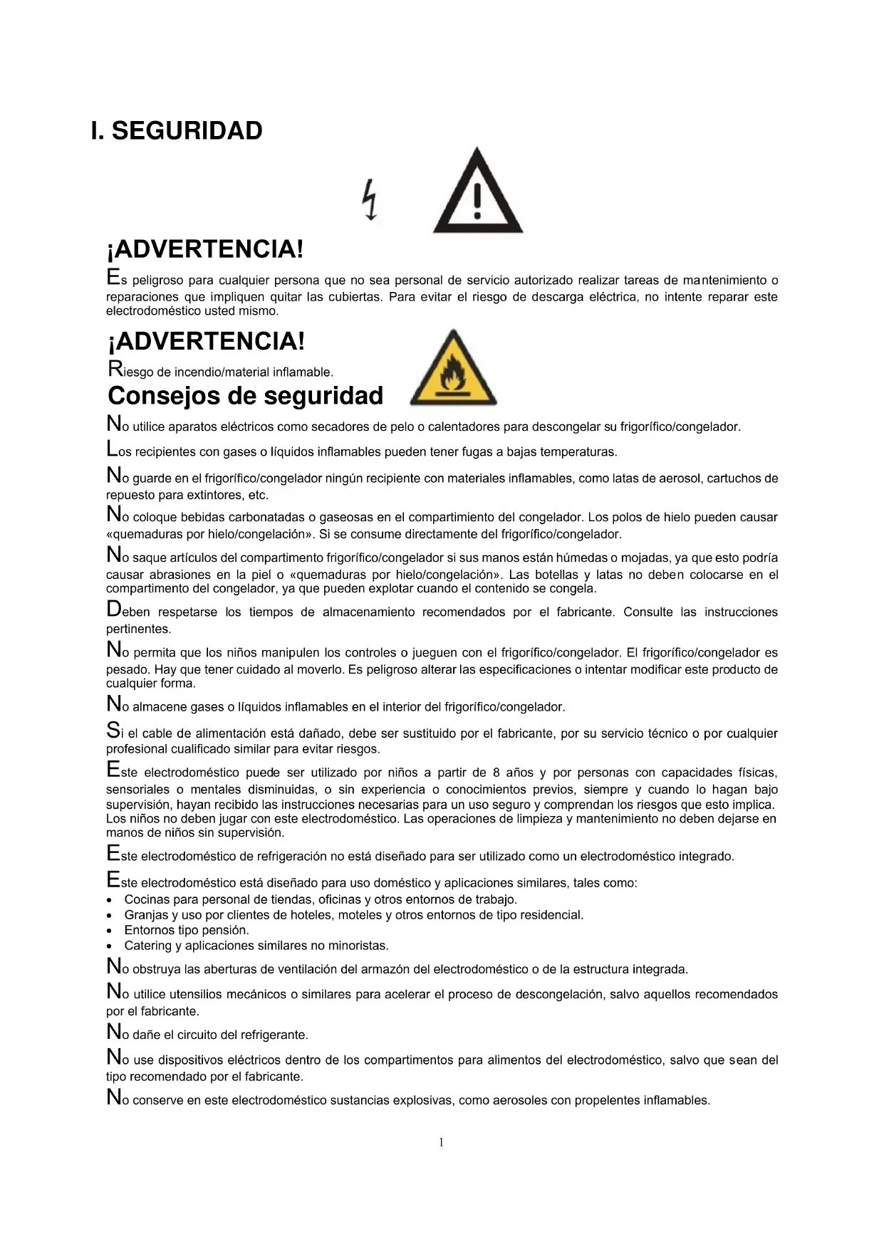 ¡ADVERTENCIA! Es peligroso para cualquier persona que no sea personal de servicio autorizado realizar tareas de mantenimiento o reparaciones que impliquen quitar las cubiertas. Para evitar el riesgo de descarga eléctrica, no intente reparar este electrodoméstico usted mismo. ¡ADVERTENCIA! Riesgo de incendio/material inflamable. Consejos de seguridad No utilice aparatos eléctricos como secadores de pelo o calentadores para descongelar su frigorífico/congelador. Los recipientes con gases o líquidos inflamables pueden tener fugas a bajas temperaturas. No guarde en el frigorífico/congelador ningún recipiente con materiales inflamables, como latas de aerosol, cartuchos de repuesto para extintores, etc. No coloque bebidas carbonatadas o gaseosas en el compartimiento del congelador. Los polos de hielo pueden causar «quemaduras por hielo/congelación». Si se consume directamente del frigorífico/congelador. No saque artículos del compartimento frigorífico/congelador si sus manos están húmedas o mojadas, ya que esto podría causar abrasiones en la piel o «quemaduras por hielo/congelación». Las botellas y latas no deben colocarse en el compartimento del congelador, ya que pueden explotar cuando el contenido se congela. Deben respetarse los tiempos de almacenamiento recomendados por el fabricante. Consulte las instrucciones pertinentes. No permita que los niños manipulen los controles o jueguen con el frigorífico/congelador. El frigorífico/congelador es pesado. Hay que tener cuidado al moverlo. Es peligroso alterar las especificaciones o intentar modificar este producto de cualquier forma. No almacene gases o líquidos inflamables en el interior del frigorífico/congelador. Si el cable de alimentación está dañado, debe ser sustituido por el fabricante, por su servicio técnico o por cualquier profesional cualificado similar para evitar riesgos. Este electrodoméstico puede ser utilizado por niños a partir de 8 años y por personas con capacidades físicas, sensoriales o mentales disminuidas, o sin experiencia o conocimientos previos, siempre y cuando lo hagan bajo supervisión, hayan recibido las instrucciones necesarias para un uso seguro y comprendan los riesgos que esto implica. Los niños no deben jugar con este electrodoméstico. Las operaciones de limpieza y mantenimiento no deben dejarse en manos de niños sin supervisión. Este electrodoméstico de refrigeración no está diseñado para ser utilizado como un electrodoméstico integrado. Este electrodoméstico está diseñado para uso doméstico y aplicaciones similares, tales como: