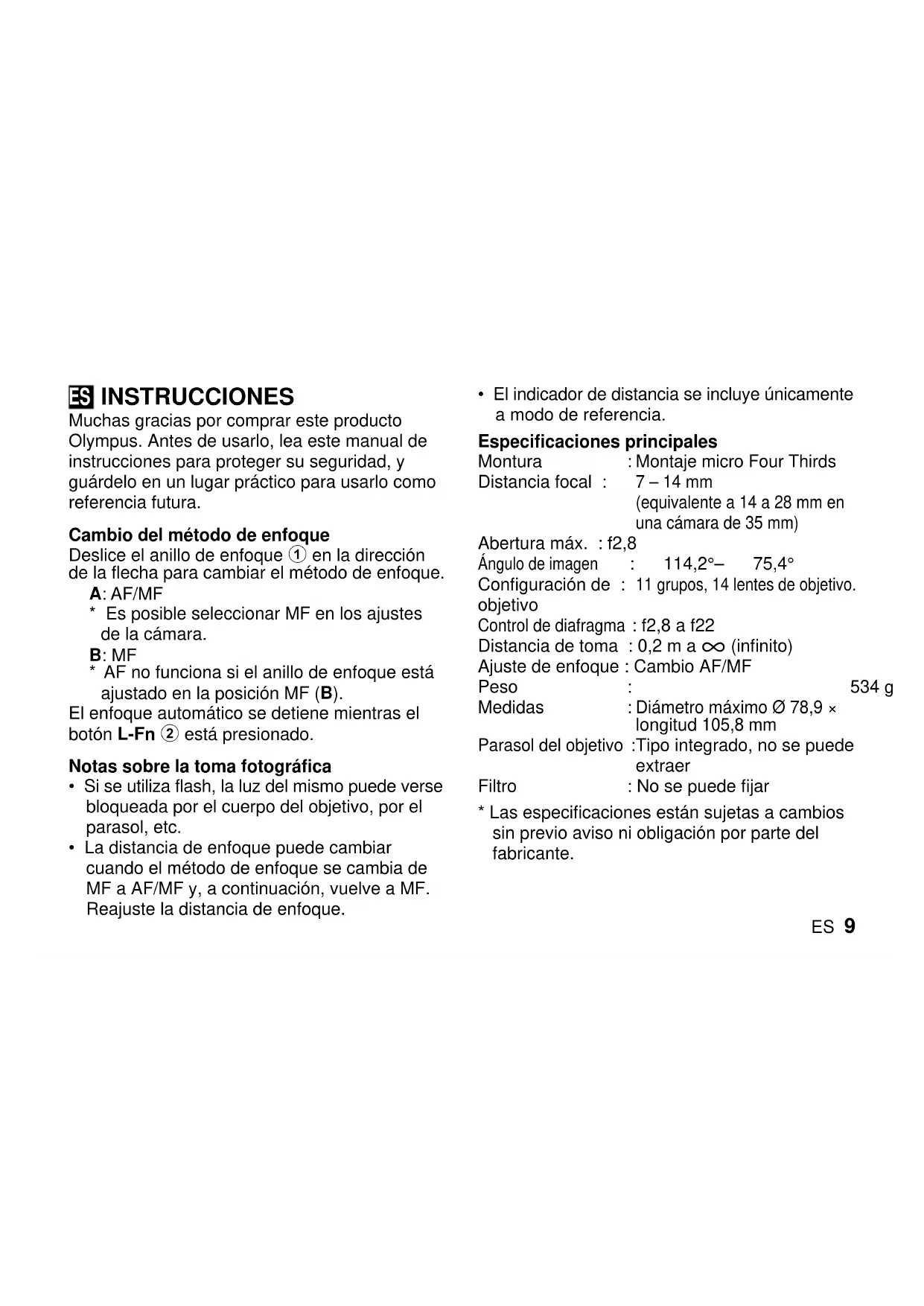 - ES 9 INSTRUCCIONES Muchas gracias por comprar este producto Olympus. Antes de usarlo, lea este manual de instrucciones para proteger su seguridad, y guárdelo en un lugar práctico para usarlo como referencia futura. Cambio del método de enfoque Deslice el anillo de enfoque 1 en la dirección de la flecha para cambiar el método de enfoque. A: AF/MF