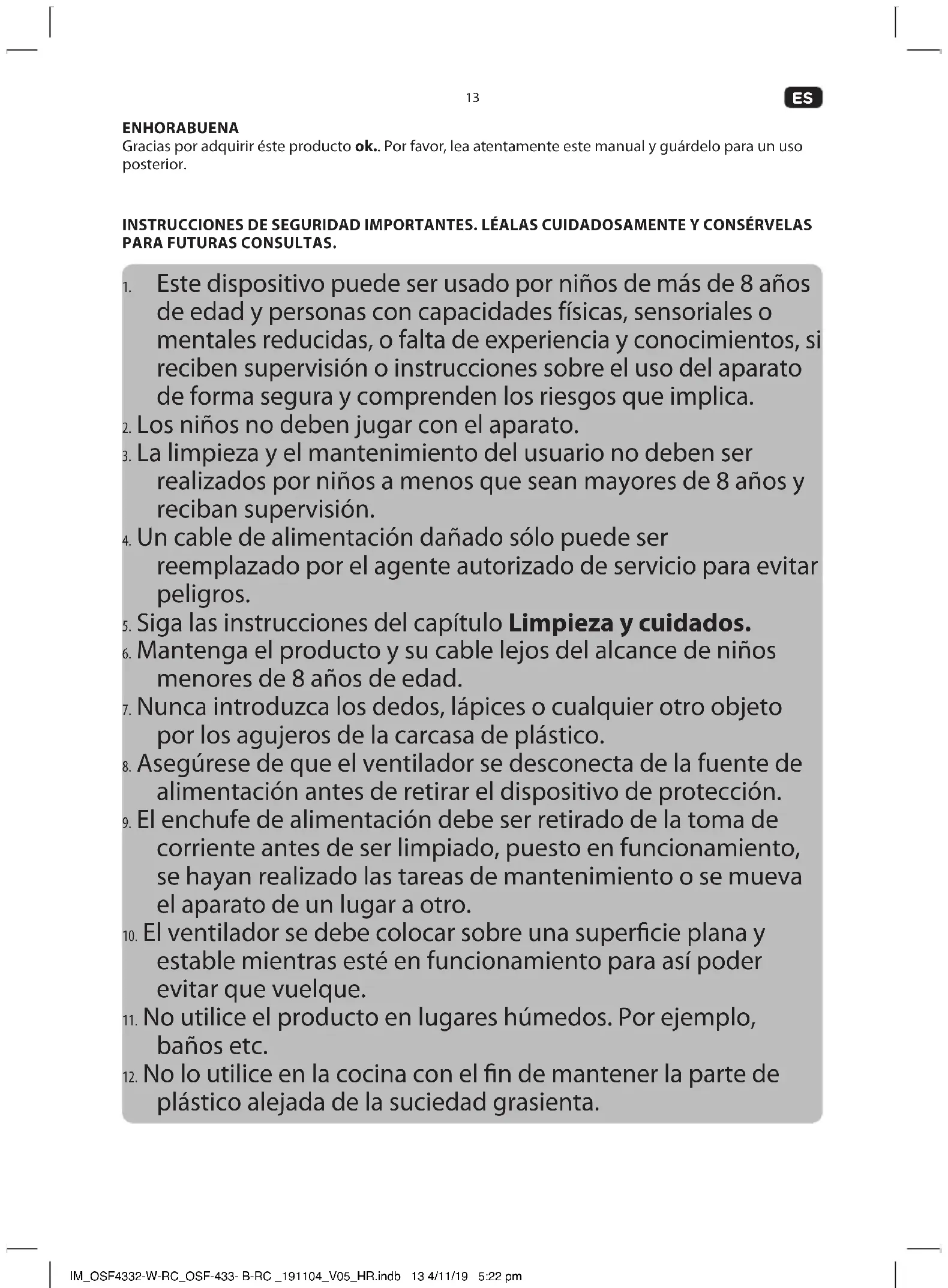 52,74 dB(A) Velocidad máxima del aire c 2,97 m/s Consumo de electricidad por temporada Q 10,34 KWh/a Estándar de medición para el valor de servicio IEC 60879:1986 (corr.1992) Detalles de contacto para obtener más información Imtron GmbH Wankelstraße 5 85046 Ingolstadt Germany ELIMINACIÓN No deseche este aparato como residuo doméstico convencional. Devuélvalo a un punto de recogida de reciclado de piezas eléctricas y electrónicas WEEE. Con ello ayudará a preservar los recursos naturales y a proteger el medio ambiente. Contactar con su vendedor o las autoridades locales para obtener más información. Deshágase de las pilas de forma respetuosa con el medioambiente. No tire las pilas junto con los residuos domésticos del hogar. Utilice los sistemas de devolución y recogida de su comunidad o póngase en contacto con el vendedor al que compró el producto. IM_OSF4332-W-RC_OSF-433- B-RC _191104_V05_HR.indb 17 4/11/19 5:22 pm18