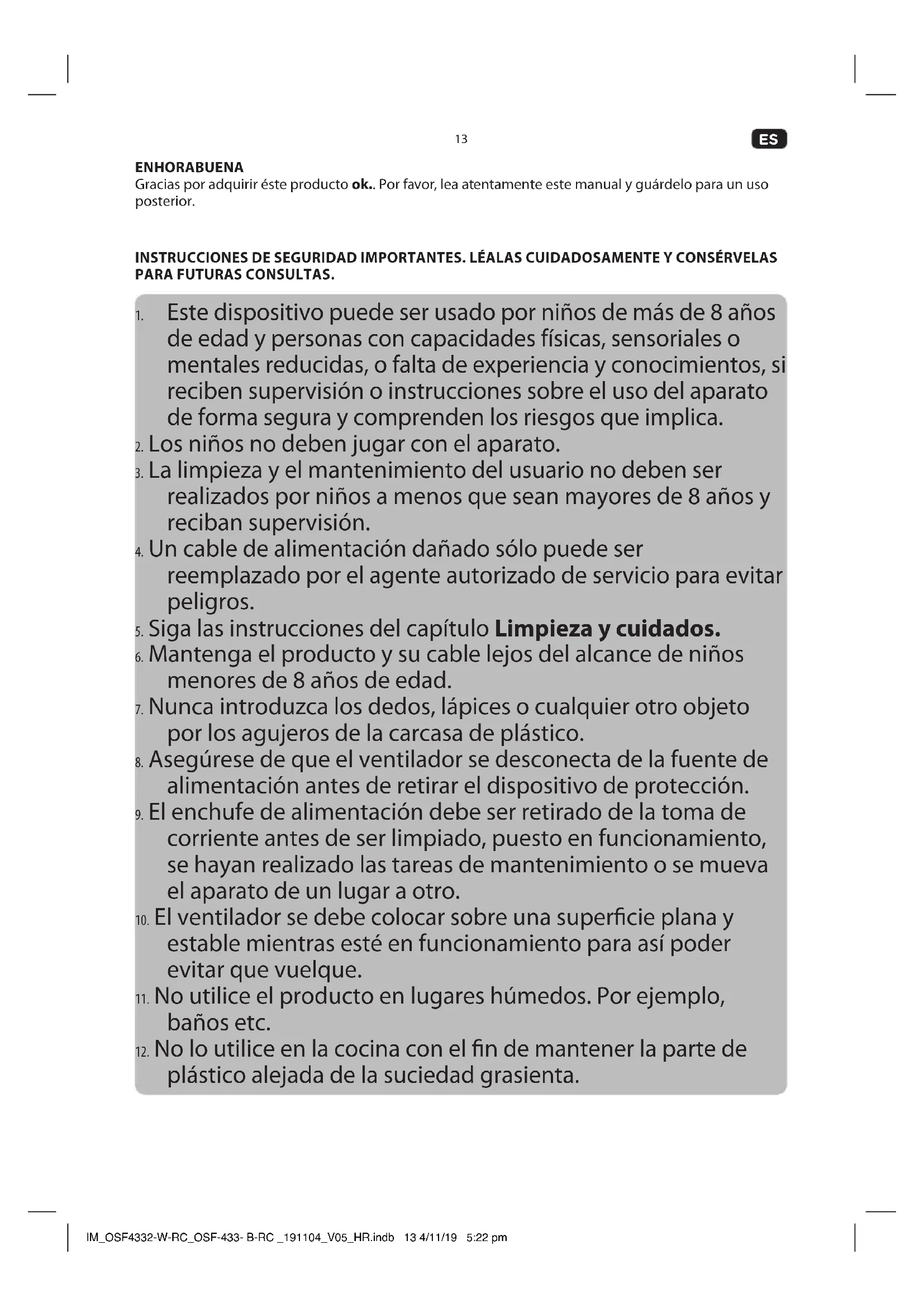 52,74 dB(A) Velocidad máxima del aire c 2,97 m/s Consumo de electricidad por temporada Q 10,34 KWh/a Estándar de medición para el valor de servicio IEC 60879:1986 (corr.1992) Detalles de contacto para obtener más información Imtron GmbH Wankelstraße 5 85046 Ingolstadt Germany ELIMINACIÓN No deseche este aparato como residuo doméstico convencional. Devuélvalo a un punto de recogida de reciclado de piezas eléctricas y electrónicas WEEE. Con ello ayudará a preservar los recursos naturales y a proteger el medio ambiente. Contactar con su vendedor o las autoridades locales para obtener más información. Deshágase de las pilas de forma respetuosa con el medioambiente. No tire las pilas junto con los residuos domésticos del hogar. Utilice los sistemas de devolución y recogida de su comunidad o póngase en contacto con el vendedor al que compró el producto. IM_OSF4332-W-RC_OSF-433- B-RC _191104_V05_HR.indb 17 4/11/19 5:22 pm18