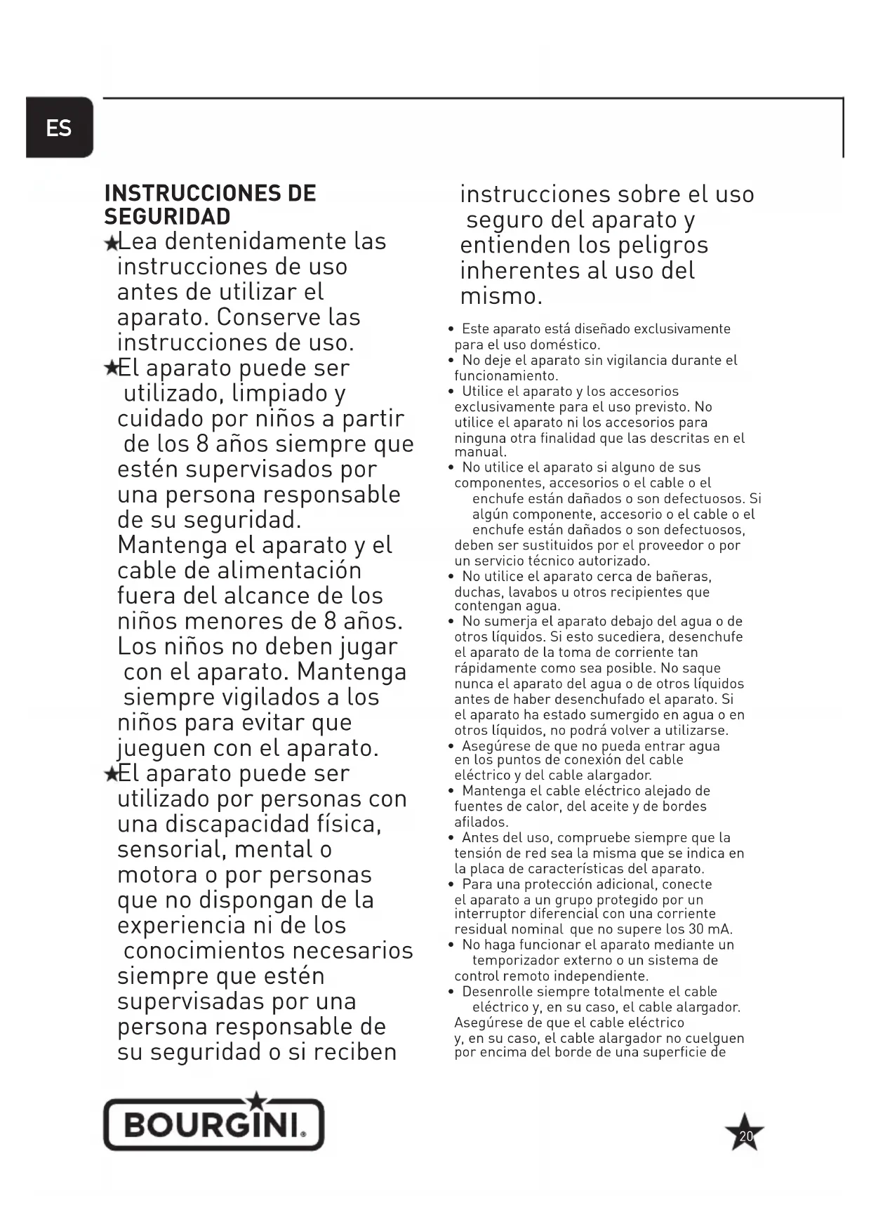 19INSTRUCCIONES DE SEGURIDAD Lea dentenidamente las instrucciones de uso antes de utilizar el aparato. Conserve las instrucciones de uso. El aparato puede ser utilizado, limpiado y cuidado por niños a partir de los 8 años siempre que estén supervisados por una persona responsable de su seguridad. Mantenga el aparato y el cable de alimentación fuera del alcance de los niños menores de 8 años. Los niños no deben jugar con el aparato. Mantenga siempre vigilados a los niños para evitar que jueguen con el aparato. El aparato puede ser utilizado por personas con una discapacidad física, sensorial, mental o motora o por personas que no dispongan de la experiencia ni de los conocimientos necesarios siempre que estén supervisadas por una persona responsable de su seguridad o si reciben instrucciones sobre el uso seguro del aparato y entienden los peligros inherentes al uso del mismo.