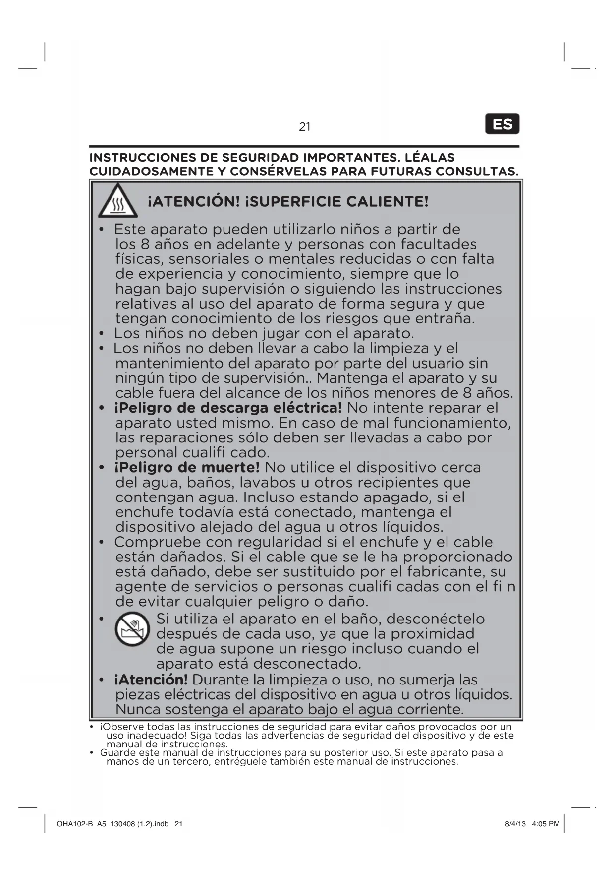 - No cubra la entrada y la salida del aire durante el uso del dispositivo. Manténgalas libres de pelusas y de pelo. OHA102-B_A5_130408 (1.2).indb 22OHA102-B_A5_130408 (1.2).indb 22 8/4/13 4:05 PM8/4/13 4:05 PM23