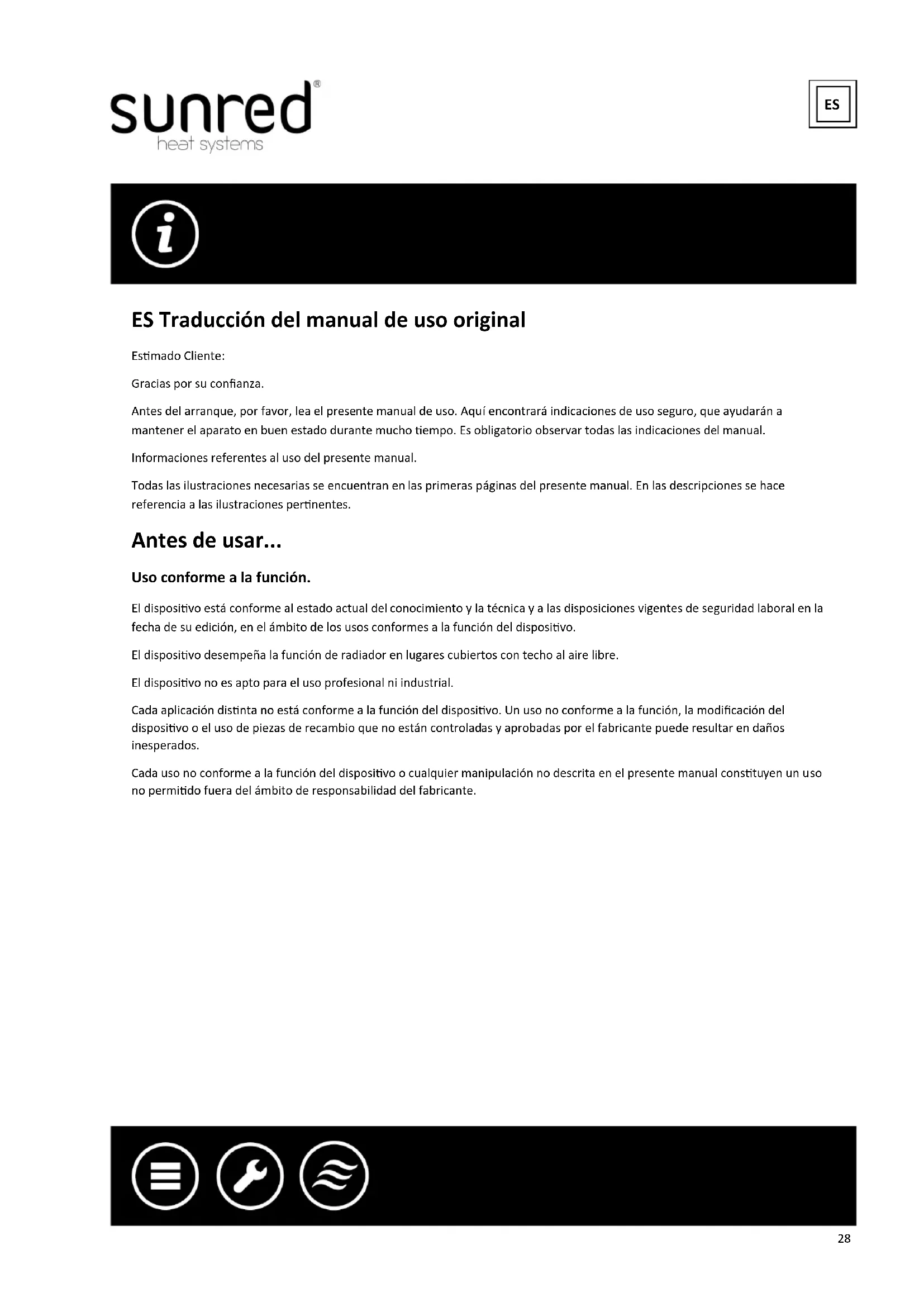 Veuillez fournir une descripon du défaut: Si vous ne fournissez pas une descripon détaillée du problème, cela peut rendre la réparaon plus dicile et prolonger le temps nécessaire pour réparer l’appareil. Si vous n’indiquez pas les défauts, l’idencaon du problème peut s’avérer dicile et une nouvelle réparaon pourrait être nécessaire. FR28 ES Traducción del manual de uso original Esmado Cliente: Gracias por su conanza. Antes del arranque, por favor, lea el presente manual de uso. Aquí encontrará indicaciones de uso seguro, que ayudarán a mantener el aparato en buen estado durante mucho empo. Es obligatorio observar todas las indicaciones del manual. Informaciones referentes al uso del presente manual. Todas las ilustraciones necesarias se encuentran en las primeras páginas del presente manual. En las descripciones se hace referencia a las ilustraciones pernentes. Antes de usar... Uso conforme a la función. El disposivo está conforme al estado actual del conocimiento y la técnica y a las disposiciones vigentes de seguridad laboral en la fecha de su edición, en el ámbito de los usos conformes a la función del disposivo. El disposivo desempeña la función de radiador en lugares cubiertos con techo al aire libre. El disposivo no es apto para el uso profesional ni industrial. Cada aplicación disnta no está conforme a la función del disposivo. Un uso no conforme a la función, la modicación del disposivo o el uso de piezas de recambio que no están controladas y aprobadas por el fabricante puede resultar en daños inesperados. Cada uso no conforme a la función del disposivo o cualquier manipulación no descrita en el presente manual constuyen un uso no permido fuera del ámbito de responsabilidad del fabricante. ES29 Por su seguridad Principios generales de seguridad