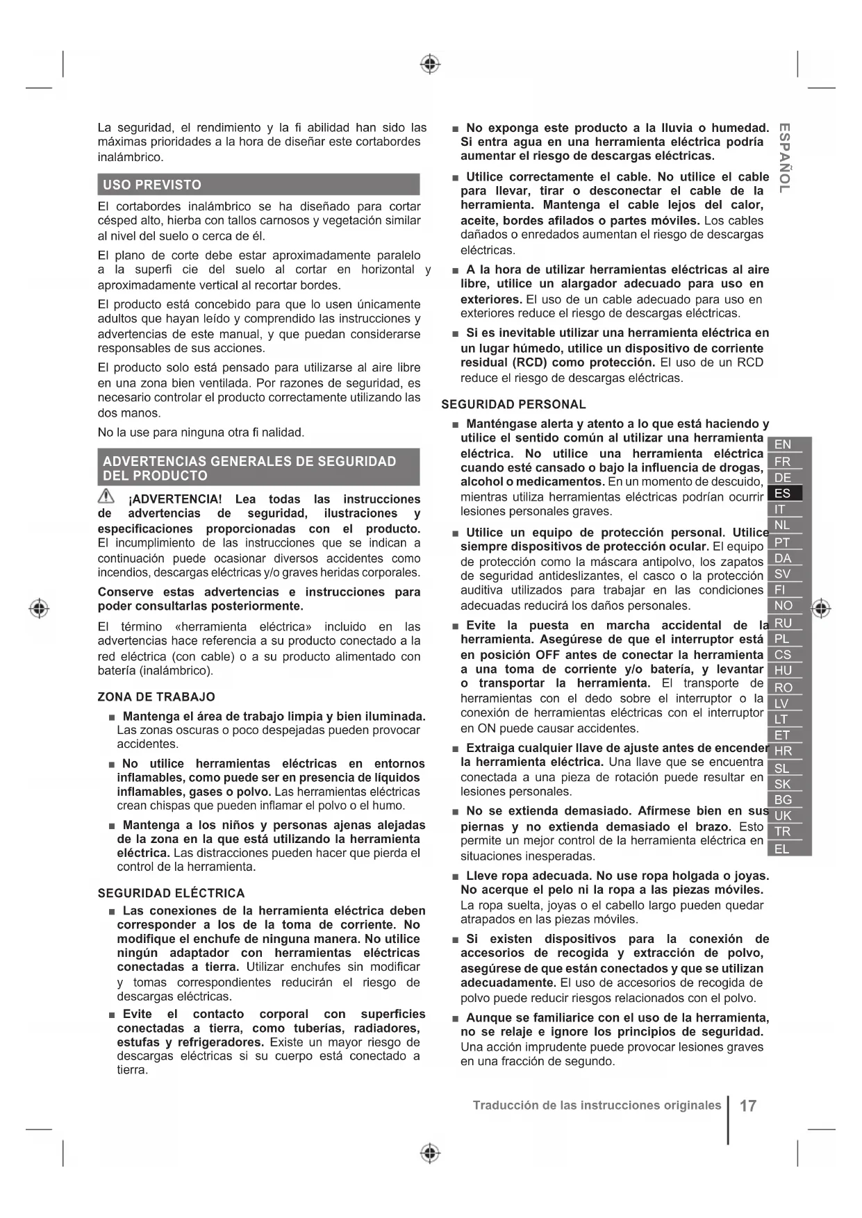 La seguridad, el rendimiento y la fi abilidad han sido las máximas prioridades a la hora de diseñar este cortabordes inalámbrico. USO PREVISTO El cortabordes inalámbrico se ha diseñado para cortar césped alto, hierba con tallos carnosos y vegetación similar al nivel del suelo o cerca de él. El plano de corte debe estar aproximadamente paralelo a la superfi cie del suelo al cortar en horizontal y aproximadamente vertical al recortar bordes. El producto está concebido para que lo usen únicamente adultos que hayan leído y comprendido las instrucciones y advertencias de este manual, y que puedan considerarse responsables de sus acciones. El producto solo está pensado para utilizarse al aire libre en una zona bien ventilada. Por razones de seguridad, es necesario controlar el producto correctamente utilizando las dos manos. No la use para ninguna otra fi nalidad.
