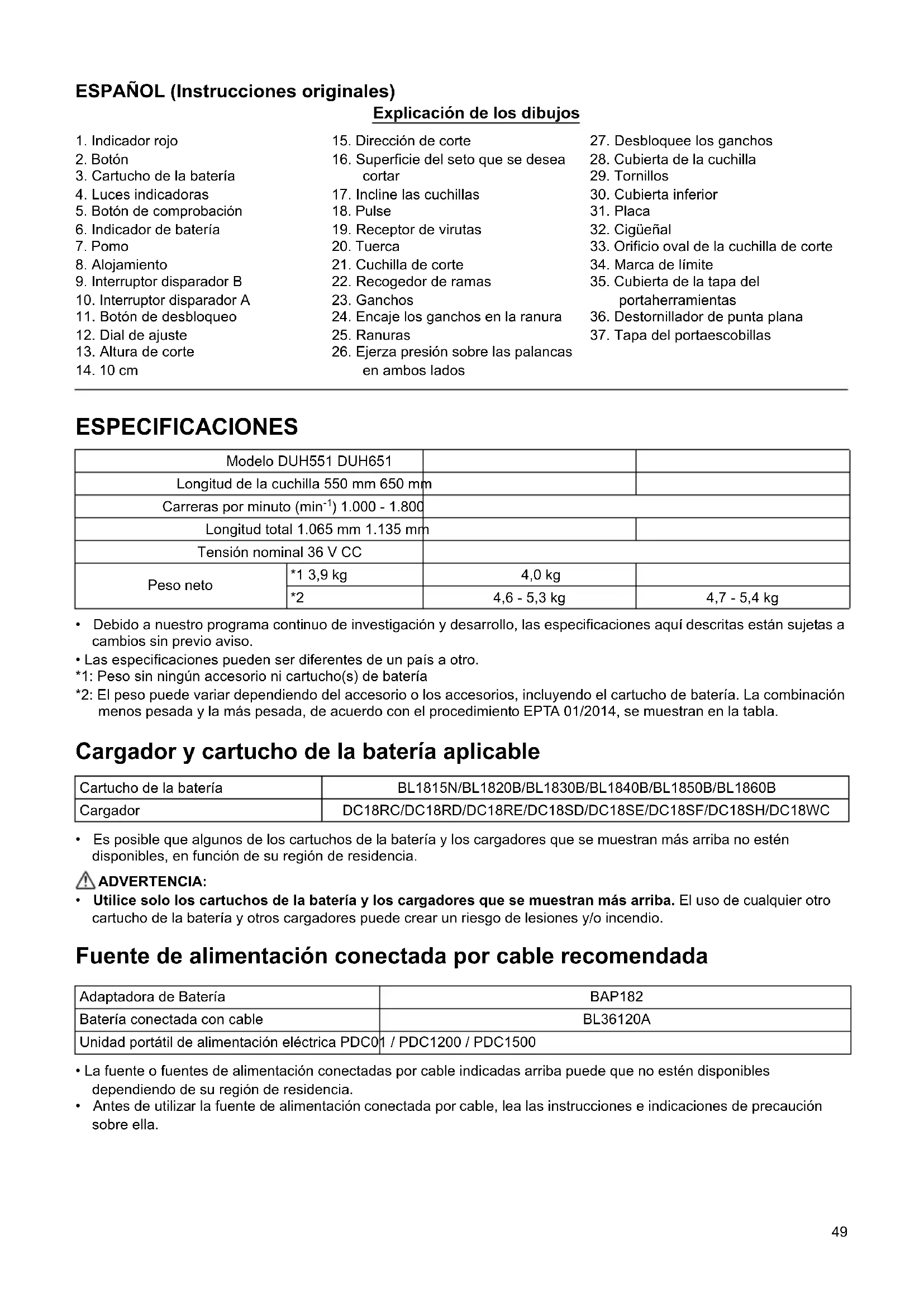 ) 1.000 - 1.800 Longitud total 1.065 mm 1.135 mm Tensión nominal 36 V CC Peso neto *1 3,9 kg 4,0 kg *2 4,6 - 5,3 kg 4,7 - 5,4 kg Cartucho de la batería BL1815N/BL1820B/BL1830B/BL1840B/BL1850B/BL1860B Cargador DC18RC/DC18RD/DC18RE/DC18SD/DC18SE/DC18SF/DC18SH/DC18WC Adaptadora de Batería BAP182 Batería conectada con cable BL36120A Unidad portátil de alimentación eléctrica PDC01 / PDC1200 / PDC150050 Ruido El nivel de ruido A-ponderado típico determinado de acuerdo con la norma EN62841-4-2: ENG907-1