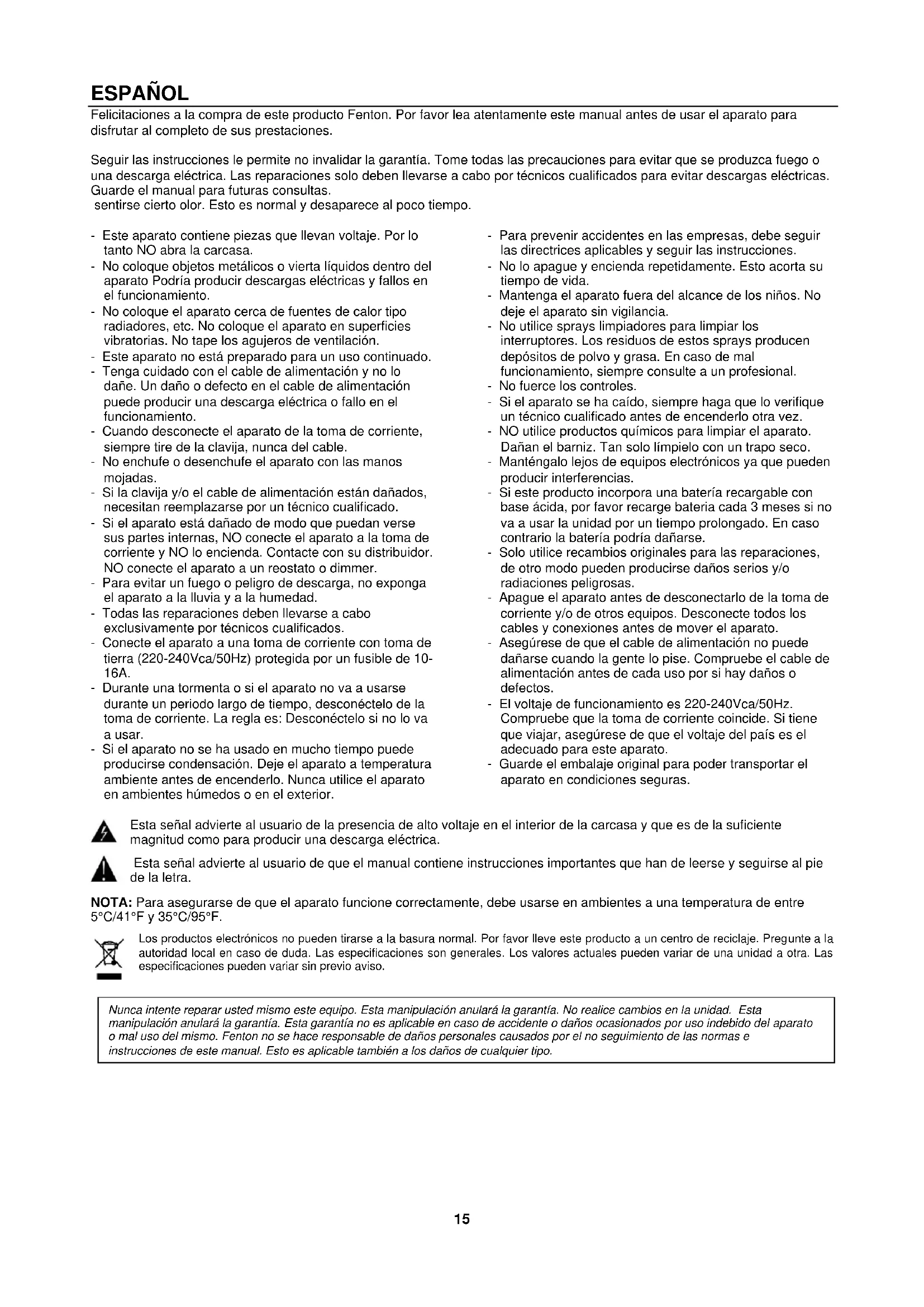 Nunca intente reparar usted mismo este equipo. Esta manipulación anulará la garantía. No realice cambios en la unidad. Esta manipulación anulará la garantía. Esta garantía no es aplicable en caso de accidente o daños ocasionados por uso indebido del aparato o mal uso del mismo. Fenton no se hace responsable de daños personales causados por el no seguimiento de las normas e instrucciones de este manual. Esto es aplicable también a los daños de cualquier tipo.16