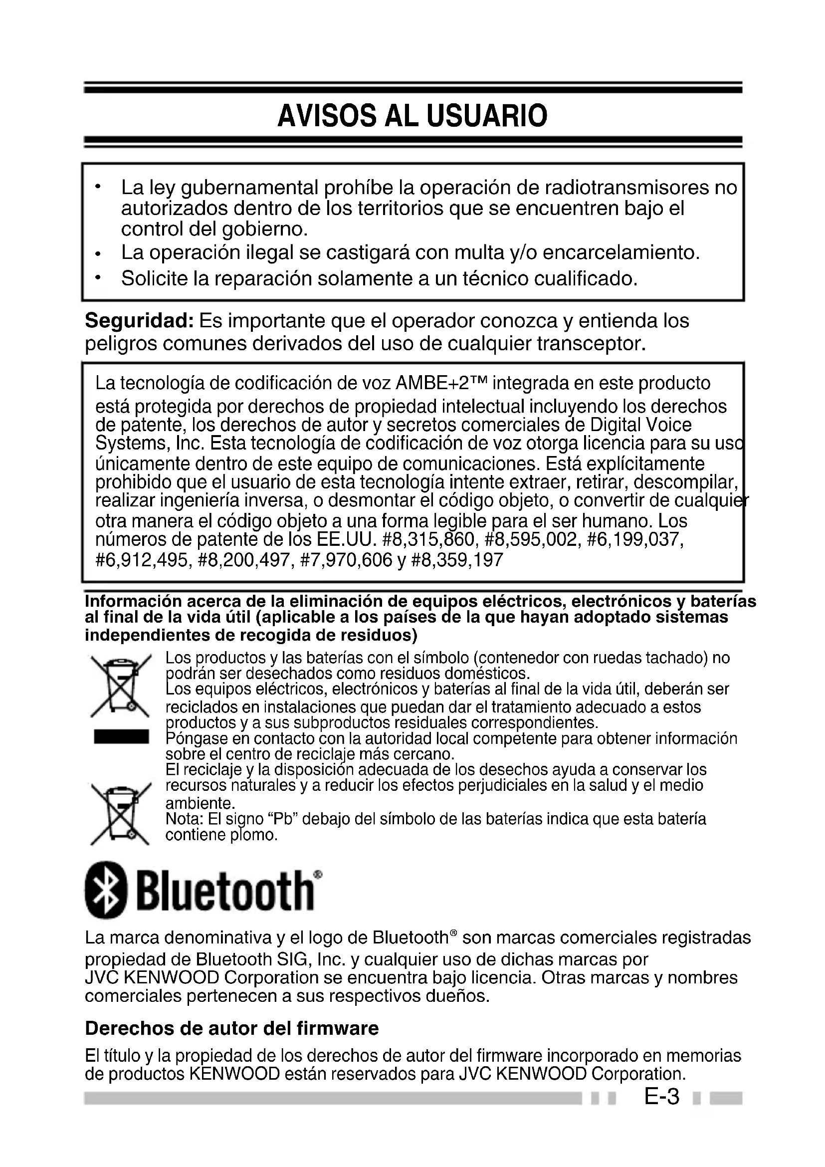 integrada en este producto está protegida por derechos de propiedad intelectual incluyendo los derechos de patente, los derechos de autor y secretos comerciales de Digital Voice Systems, Inc. Esta tecnología de codificación de voz otorga licencia para su uso únicamente dentro de este equipo de comunicaciones. Está explícitamente prohibido que el usuario de esta tecnología intente extraer, retirar, descompilar, realizar ingeniería inversa, o desmontar el código objeto, o convertir de cualquier otra manera el código objeto a una forma legible para el ser humano. Los números de patente de los EE.UU. #8,315,860, #8,595,002, #6,199,037, #6,912,495, #8,200,497, #7,970,606 y #8,359,197 Información acerca de la eliminación de equipos eléctricos, electrónicos y bateríasal final de la vida útil (aplicable a los países de la que hayan adoptado sistemasindependientes de recogida de residuos).Los productos y las baterías con el símbolo (contenedor con ruedas tachado) nopodrán ser desechados como residuos domésticos.Los equipos eléctricos, electrónicos y baterías al final de la vida útil, deberán serreciclados en instalaciones que puedan dar el tratamiento adecuado a estosproductos y a sus subproductos residuales correspondientes.Póngase en contacto con la autoridad local competente para obtener informaciónsobre el centro de reciclaje más cercano.El reciclaje y la disposición adecuada de los desechos ayuda a conservar losrecursos naturales y a reducir los efectos perjudiciales en la salud y el medioambiente.Nota: El signo “Pb” debajo del símbolo de las baterías indica que esta bateríacontiene plomo. La marca denominativa y el logo de Bluetooth® son marcas comerciales registradaspropiedad de Bluetooth SIG, Inc. y cualquier uso de dichas marcas porJVC KENWOOD Corporation se encuentra bajo licencia. Otras marcas y nombrescomerciales pertenecen a sus respectivos dueños. Derechos de autor del firmware El título y la propiedad de los derechos de autor del firmware incorporado en memoriasde productos KENWOOD están reservados para JVC KENWOOD Corporation. E-3PRECAUCIONES