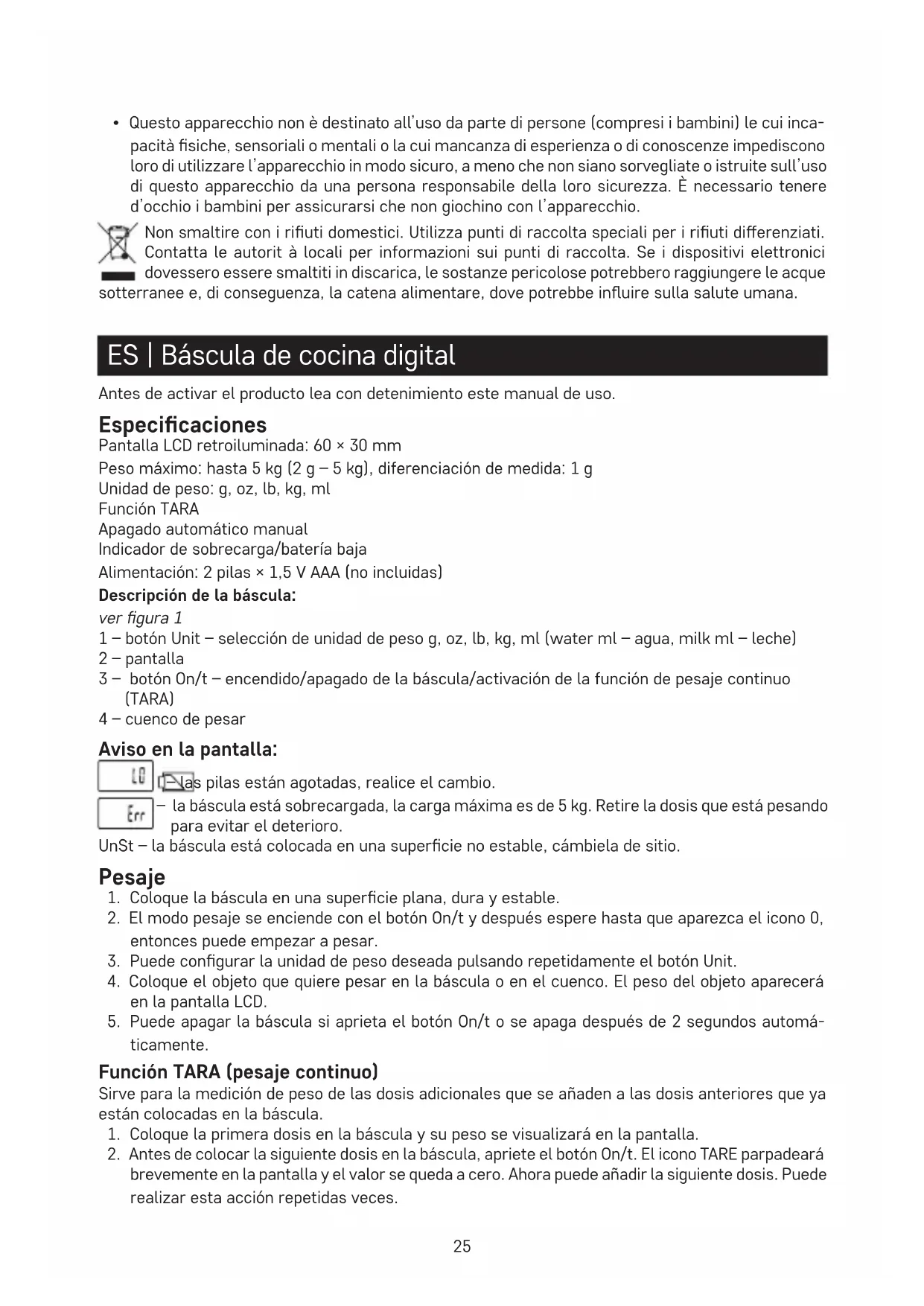 - Esta báscula está destinada solo para pesar los alimentos y para el uso doméstico.