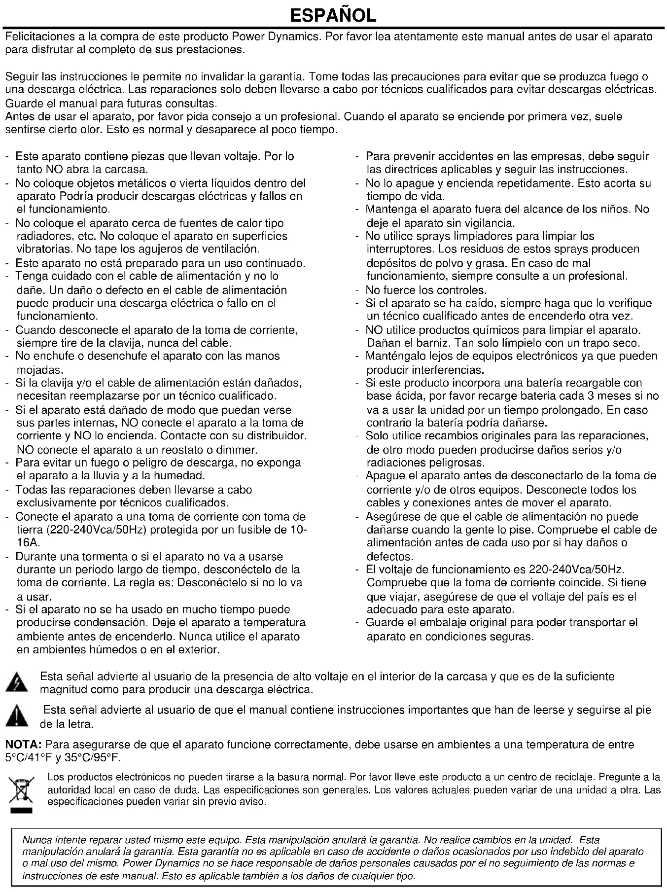 HEADSET MIKROFON Verbinden Sie den Stecker des mitgelieferten Headset-Mikrofons mit der Anschlussbuchse des Taschensender. Positionieren Sie das Headset - Mikrofon ca. 15mm von der Öffnung Ihres Mundes.ESPAÑOL Felicitaciones a la compra de este producto Power Dynamics. Por favor lea atentamente este manual antes de usar el aparato para disfrutar al completo de sus prestaciones. Seguir las instrucciones le permite no invalidar la garantía. Tome todas las precauciones para evitar que se produzca fuego o una descarga eléctrica. Las reparaciones solo deben llevarse a cabo por técnicos cualificados para evitar descargas eléctricas. Guarde el manual para futuras consultas. Antes de usar el aparato, por favor pida consejo a un profesional. Cuando el aparato se enciende por primera vez, suele sentirse cierto olor. Esto es normal y desaparece al poco tiempo. - Este aparato contiene piezas que llevan voltaje. Por lo tanto NO abra la carcasa. - No coloque objetos metálicos o vierta líquidos dentro del aparato Podría producir descargas eléctricas y fallos en el funcionamiento. - No coloque el aparato cerca de fuentes de calor tipo radiadores, etc. No coloque el aparato en superficies vibratorias. No tape los agujeros de ventilación. - Este aparato no está preparado para un uso continuado. - Tenga cuidado con el cable de alimentación y no lo dañe. Un daño o defecto en el cable de alimentación puede producir una descarga eléctrica o fallo en el funcionamiento. - Cuando desconecte el aparato de la toma de corriente, siempre tire de la clavija, nunca del cable. - No enchufe o desenchufe el aparato con las manos mojadas. - Si la clavija y/o el cable de alimentación están dañados, necesitan reemplazarse por un técnico cualificado. - Si el aparato está dañado de modo que puedan verse sus partes internas, NO conecte el aparato a la toma de corriente y NO lo encienda. Contacte con su distribuidor. NO conecte el aparato a un reostato o dimmer. - Para evitar un fuego o peligro de descarga, no exponga el aparato a la lluvia y a la humedad. - Todas las reparaciones deben llevarse a cabo exclusivamente por técnicos cualificados. - Conecte el aparato a una toma de corriente con toma de tierra (220-240Vca/50Hz) protegida por un fusible de 10- 16A. - Durante una tormenta o si el aparato no va a usarse durante un periodo largo de tiempo, desconéctelo de la toma de corriente. La regla es: Desconéctelo si no lo va a usar. - Si el aparato no se ha usado en mucho tiempo puede producirse condensación. Deje el aparato a temperatura ambiente antes de encenderlo. Nunca utilice el aparato en ambientes húmedos o en el exterior. - Para prevenir accidentes en las empresas, debe seguir las directrices aplicables y seguir las instrucciones. - No lo apague y encienda repetidamente. Esto acorta su tiempo de vida. - Mantenga el aparato fuera del alcance de los niños. No deje el aparato sin vigilancia. - No utilice sprays limpiadores para limpiar los interruptores. Los residuos de estos sprays producen depósitos de polvo y grasa. En caso de mal funcionamiento, siempre consulte a un profesional. - No fuerce los controles. - Si el aparato se ha caído, siempre haga que lo verifique un técnico cualificado antes de encenderlo otra vez. - NO utilice productos químicos para limpiar el aparato. Dañan el barniz. Tan solo límpielo con un trapo seco. - Manténgalo lejos de equipos electrónicos ya que pueden producir interferencias. - Si este producto incorpora una batería recargable con base ácida, por favor recarge bateria cada 3 meses si no va a usar la unidad por un tiempo prolongado. En caso contrario la batería podría dañarse. - Solo utilice recambios originales para las reparaciones, de otro modo pueden producirse daños serios y/o radiaciones peligrosas. - Apague el aparato antes de desconectarlo de la toma de corriente y/o de otros equipos. Desconecte todos los cables y conexiones antes de mover el aparato. - Asegúrese de que el cable de alimentación no puede dañarse cuando la gente lo pise. Compruebe el cable de alimentación antes de cada uso por si hay daños o defectos. - El voltaje de funcionamiento es 220-240Vca/50Hz. Compruebe que la toma de corriente coincide. Si tiene que viajar, asegúrese de que el voltaje del país es el adecuado para este aparato. - Guarde el embalaje original para poder transportar el aparato en condiciones seguras. Esta señal advierte al usuario de la presencia de alto voltaje en el interior de la carcasa y que es de la suficiente magnitud como para producir una descarga eléctrica. Esta señal advierte al usuario de que el manual contiene instrucciones importantes que han de leerse y seguirse al pie de la letra. NOTA: Para asegurarse de que el aparato funcione correctamente, debe usarse en ambientes a una temperatura de entre 5°C/41°F y 35°C/95°F. Los productos electrónicos no pueden tirarse a la basura normal. Por favor lleve este producto a un centro de reciclaje. Pregunte a la autoridad local en caso de duda. Las especificaciones son generales. Los valores actuales pueden variar de una unidad a otra. Las especificaciones pueden variar sin previo aviso.