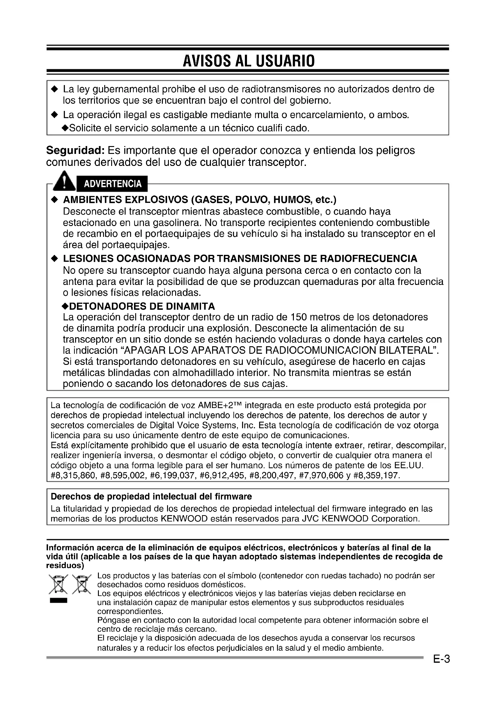 La operación del transceptor dentro de un radio de 150 metros de los detonadores de dinamita podría producir una explosión. Desconecte la alimentación de su transceptor en un sitio donde se estén haciendo voladuras o donde haya carteles con la indicación “APAGAR LOS APARATOS DE RADIOCOMUNICACION BILATERAL”. Si está transportando detonadores en su vehículo, asegúrese de hacerlo en cajas metálicas blindadas con almohadillado interior. No transmita mientras se están poniendo o sacando los detonadores de sus cajas. La tecnología de codificación de voz AMBE+2™ integrada en este producto está protegida por derechos de propiedad intelectual incluyendo los derechos de patente, los derechos de autor y secretos comerciales de Digital Voice Systems, Inc. Esta tecnología de codificación de voz otorga licencia para su uso únicamente dentro de este equipo de comunicaciones. Está explícitamente prohibido que el usuario de esta tecnología intente extraer, retirar, descompilar, realizer ingeniería inversa, o desmontar el código objeto, o convertir de cualquier otra manera el código objeto a una forma legible para el ser humano. Los números de patente de los EE.UU. #8,315,860, #8,595,002, #6,199,037, #6,912,495, #8,200,497, #7,970,606 y #8,359,197. Derechos de propiedad intelectual del firmware La titularidad y propiedad de los derechos de propiedad intelectual del firmware integrado en las memorias de los productos KENWOOD están reservados para JVC KENWOOD Corporation. Información acerca de la eliminación de equipos eléctricos, electrónicos y baterías al final de la vida útil (aplicable a los países de la que hayan adoptado sistemas independientes de recogida de residuos) Los productos y las baterías con el símbolo (contenedor con ruedas tachado) no podrán ser desechados como residuos domésticos. Los equipos eléctricos y electrónicos viejos y las baterías viejas deben reciclarse en una instalación capaz de manipular estos elementos y sus subproductos residuales correspondientes. Póngase en contacto con la autoridad local competente para obtener información sobre el centro de reciclaje más cercano. El reciclaje y la disposición adecuada de los desechos ayuda a conservar los recursos naturales y a reducir los efectos perjudiciales en la salud y el medio ambiente.E-4 PRECAUCIONES Observe las siguientes precauciones para evitar incendios, lesiones personales y daños al transceptor.